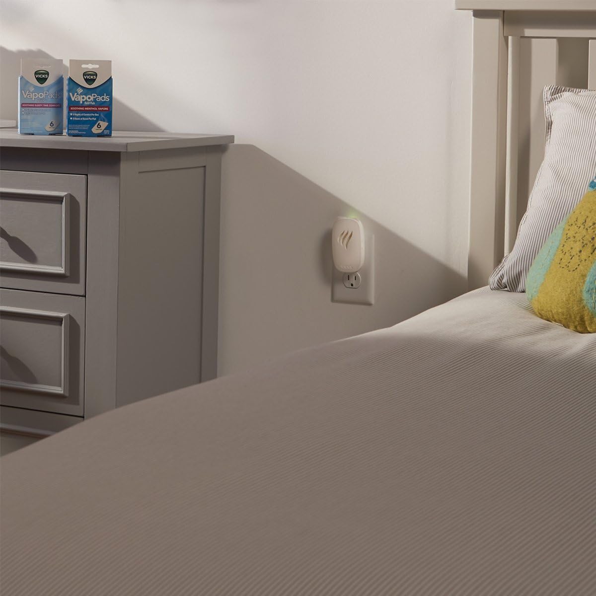 - VICKS VAPORIZER & VAPOPADS: Plug the Vicks Waterless Vaporizer into an outlet & enjoy soothing Vicks vapor with a non-medicated menthol scent. This plug in waterless vaporizer provides a soft glow nightlight for nights when feeling unwell keeps you up.