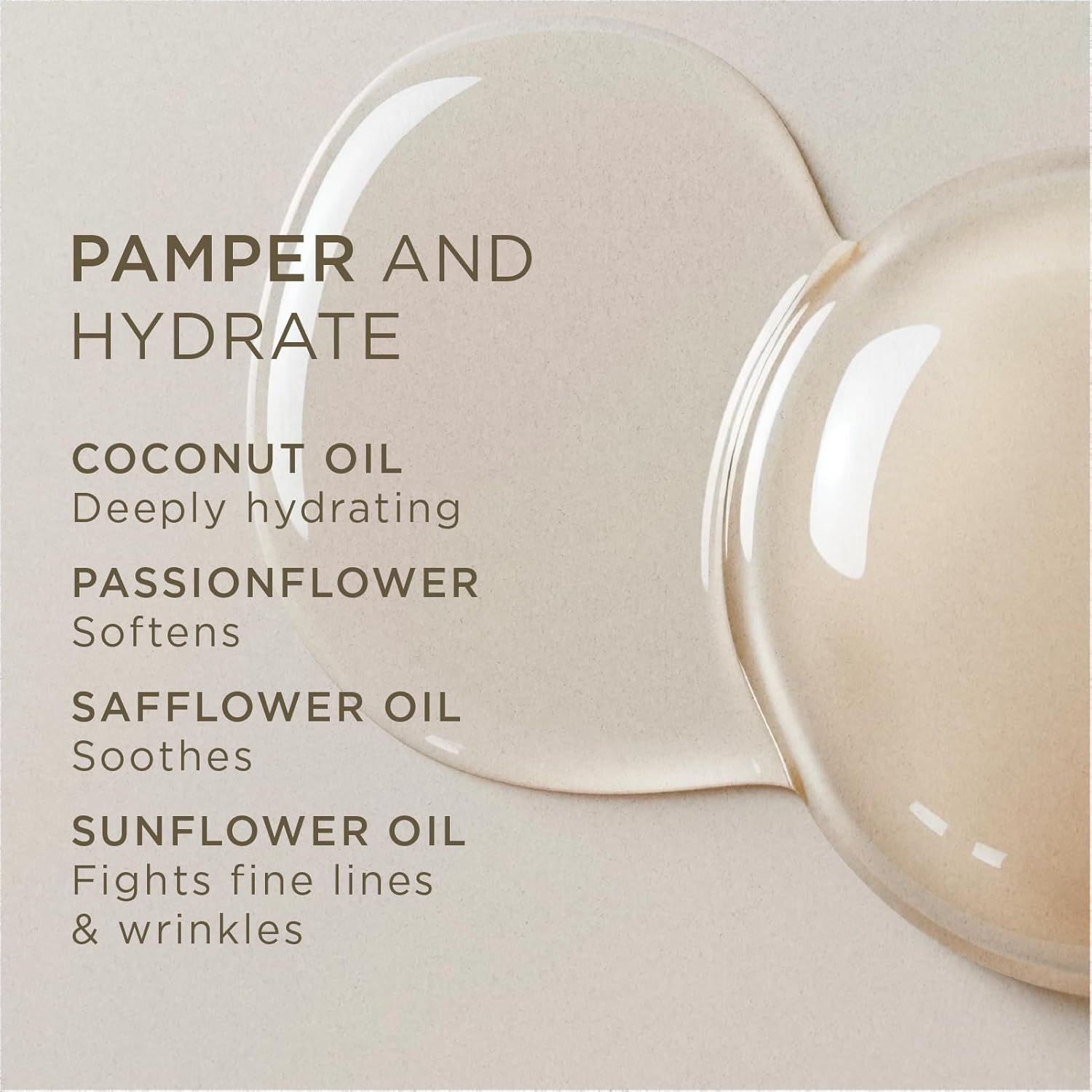 - NATURAL INGREDIENTS. Antioxidant-rich coconut oil and Vitamin E help prevent the signs of aging and promote skin-cell regeneration to minimize the appearance of wrinkles and improve the look of stretch marks. Sunflower and safflower oils offer soothing benefits that improve the texture and softness of the skin.