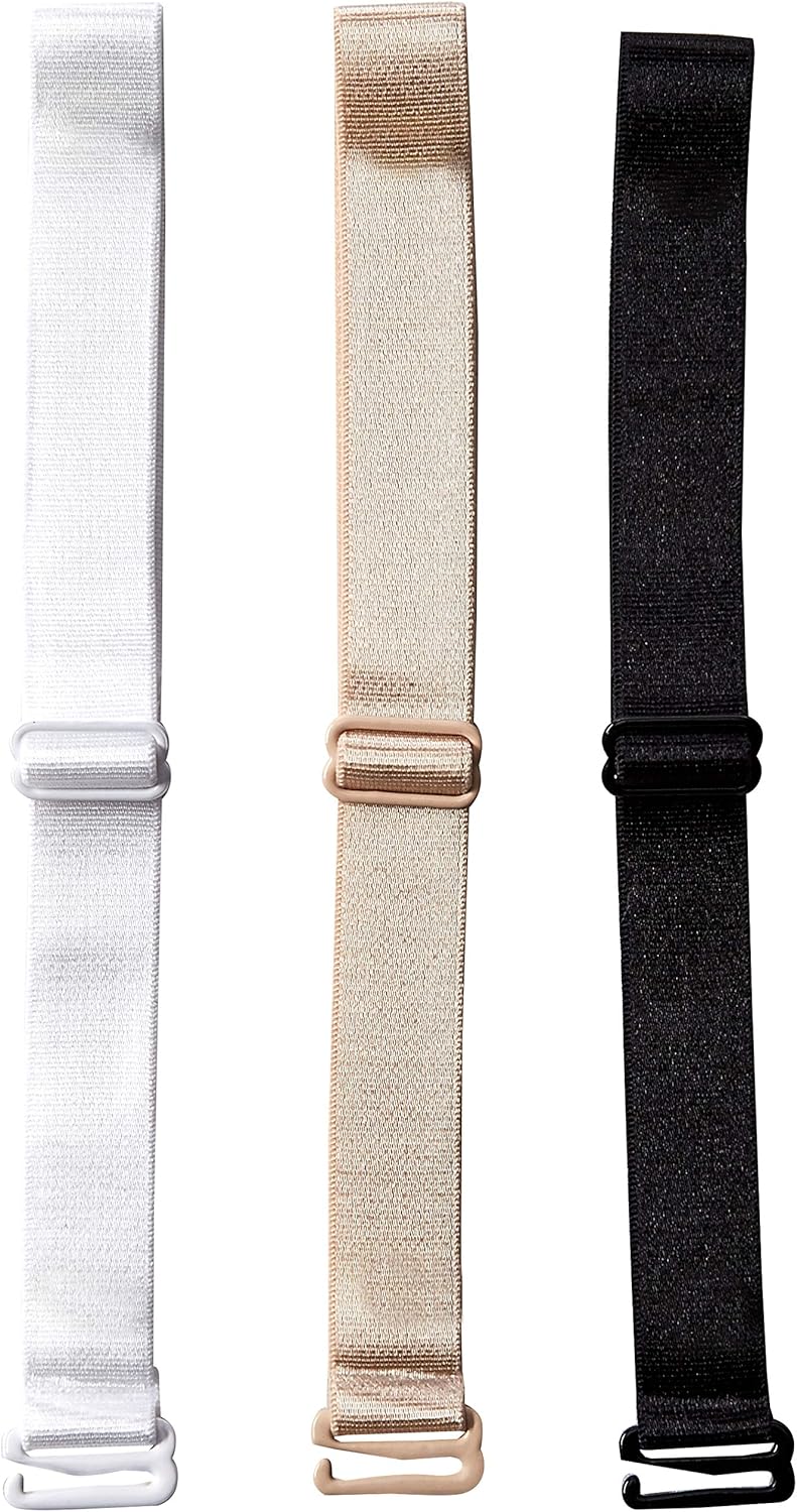 - Three-pack of bra strap holders in white, nude, and black to match your favorite bras.