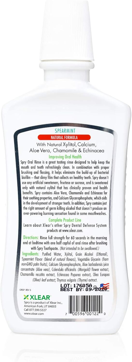 Spry Natural Xylitol Mouthwash Fluoride Free with Enamel Support, Gentle Alcohol Oral Rinse, Non-GMO, Spearmint - 16 fl oz (Pack of 1)