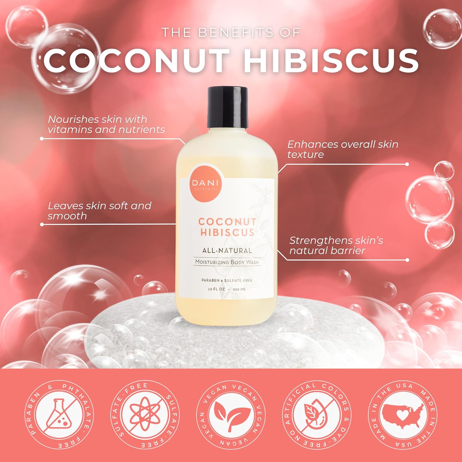 DANI Naturals Moisturizing Body Wash - Tropical Coconut Hibiscus Scent with Organic Aloe Vera & Natural Glycerin - Paraben & Sulfate-Free Shower Gel - 12 oz - Vegan & Cruelty-Free