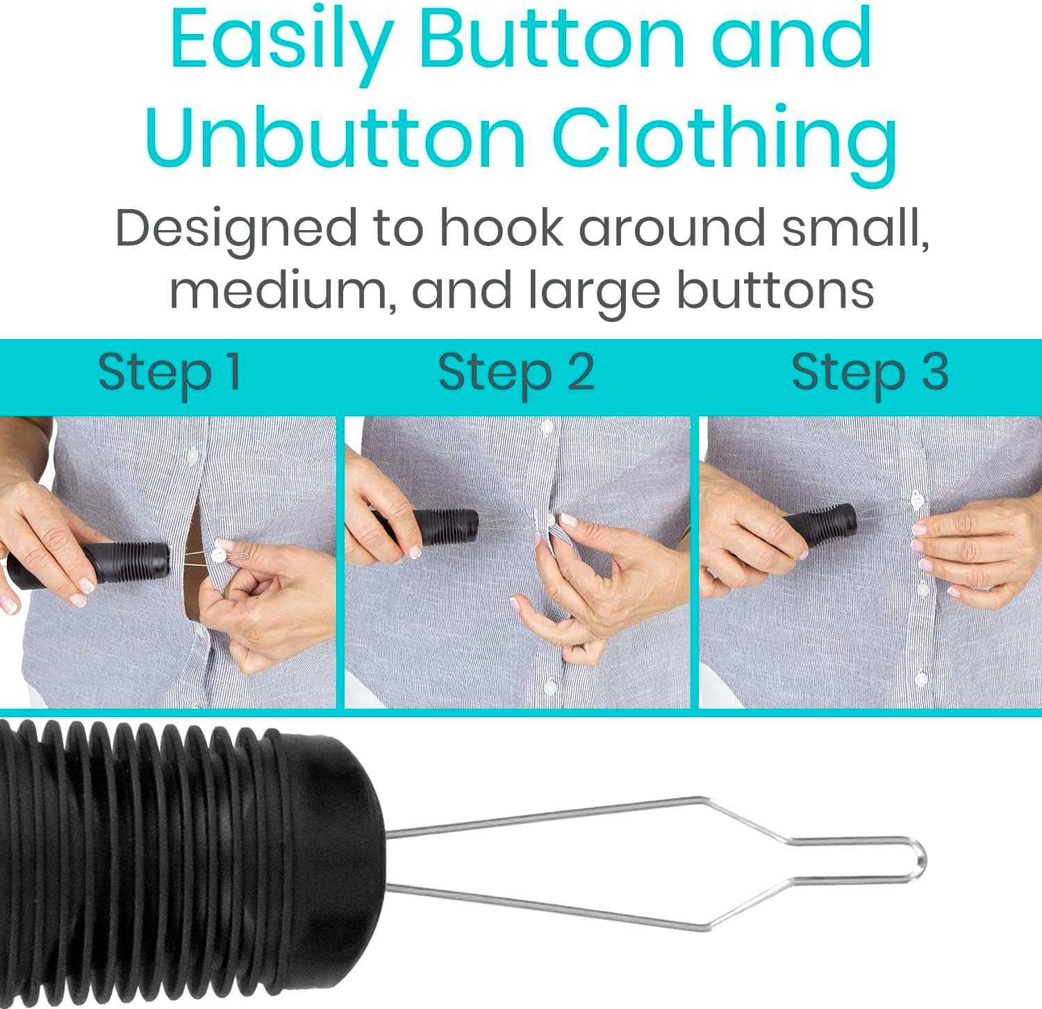 - πππ¦π¬ ππ₯ππ£ πππ‘πππ: The button hook has a flexible ribbed handle to provide a comfortable, non-slip grip. Perfect for arthritic hands, the latex-free cushioned handle is comfortably wide to allow for greater control when securing buttons or zipping pants, jackets or other clothing.