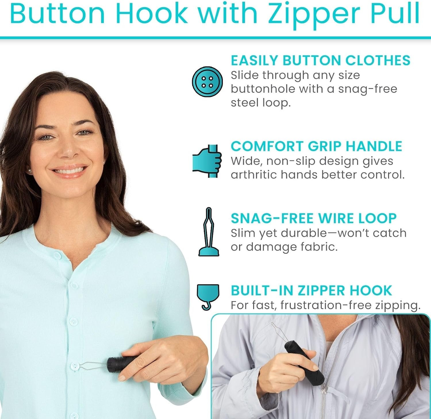 Vive Button Hook with Zipper Pull - Dressing Helper Assist Tool for Arthritis - One Hand Shirt & Coat Buttoning Aid, Disability, Handicapped, Seniors, Elderly - Limited Dexterity, Wide Grip Handle