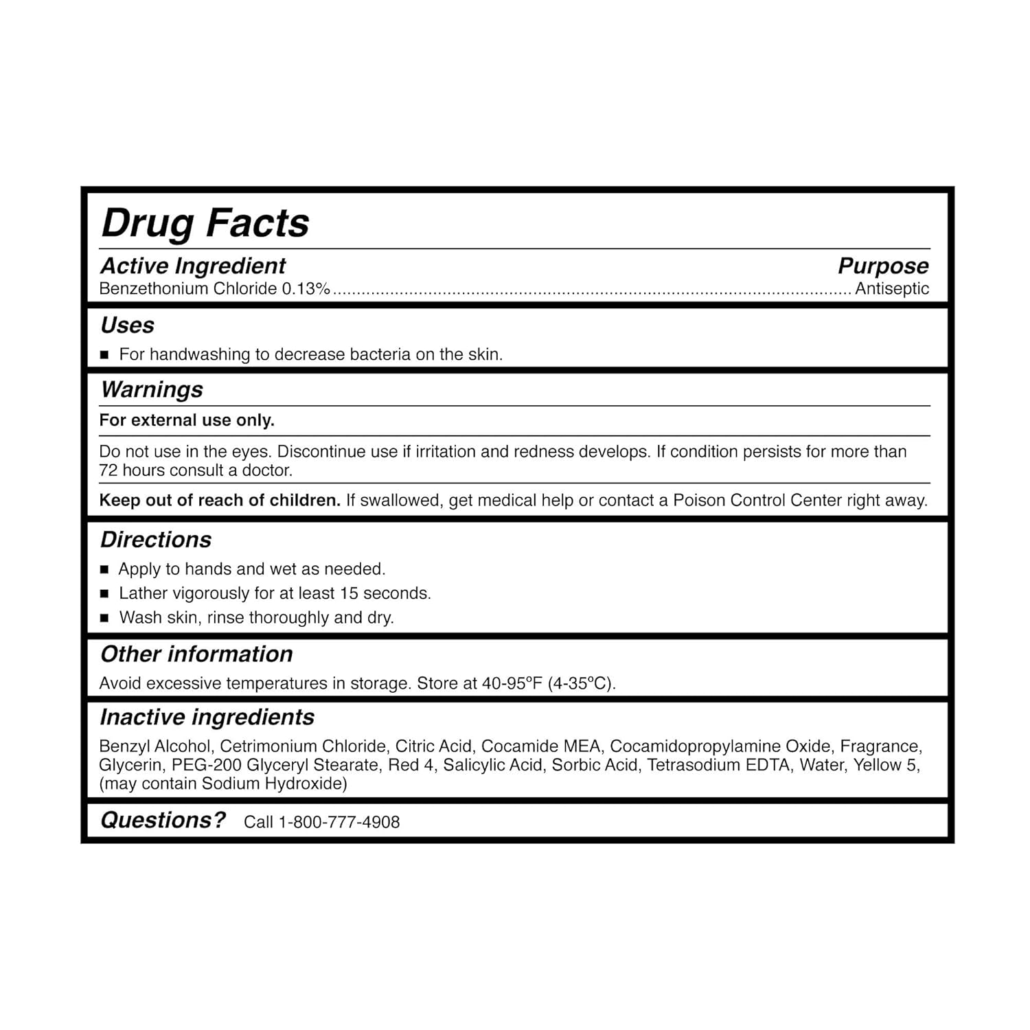 - To reduce bacteria on the skin, it contains benzethonium chloride (0.13); gentle formulation gently cleans and moisturizes skin, and the clean scent keeps your hands feeling fresh
