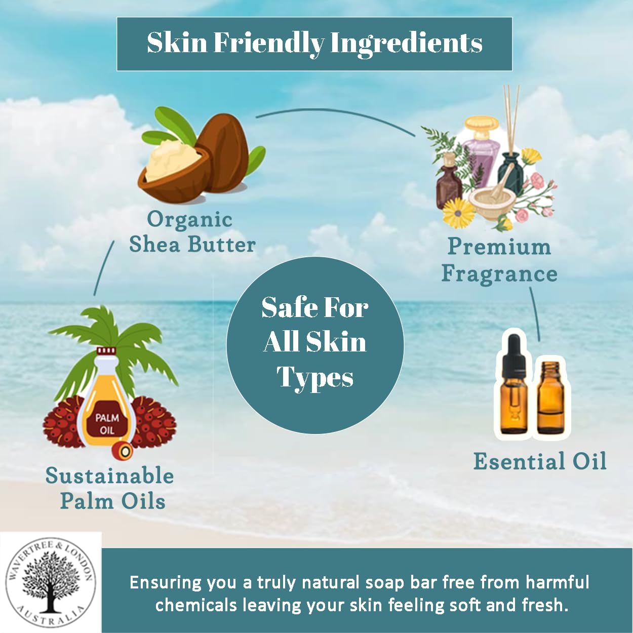 Wavertree & London Beach Scented Natural Soap Bar, 7oz Moisturizing French Triple Milled Soap Bar for Women & Men enriched with shea butter - Pure Bath & Body soap bar for All Skin Types