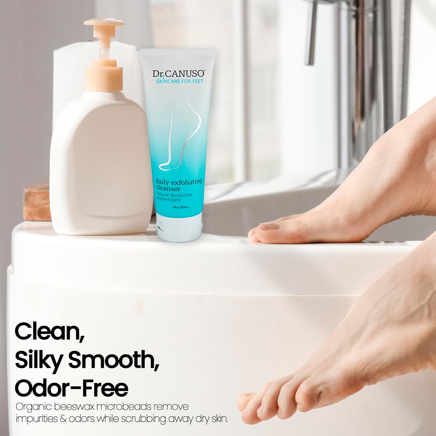 - EXFOLIATING FOOT CLEANSER : Say hello to healthy feet with the Dr. Canuso exfoliating foot scrub. Our nourishing foot wash uses eco-friendly beeswax microbeads to slough away oil, dirt, and dead skin for ultra soft, hydrated feet that you can feel good about.