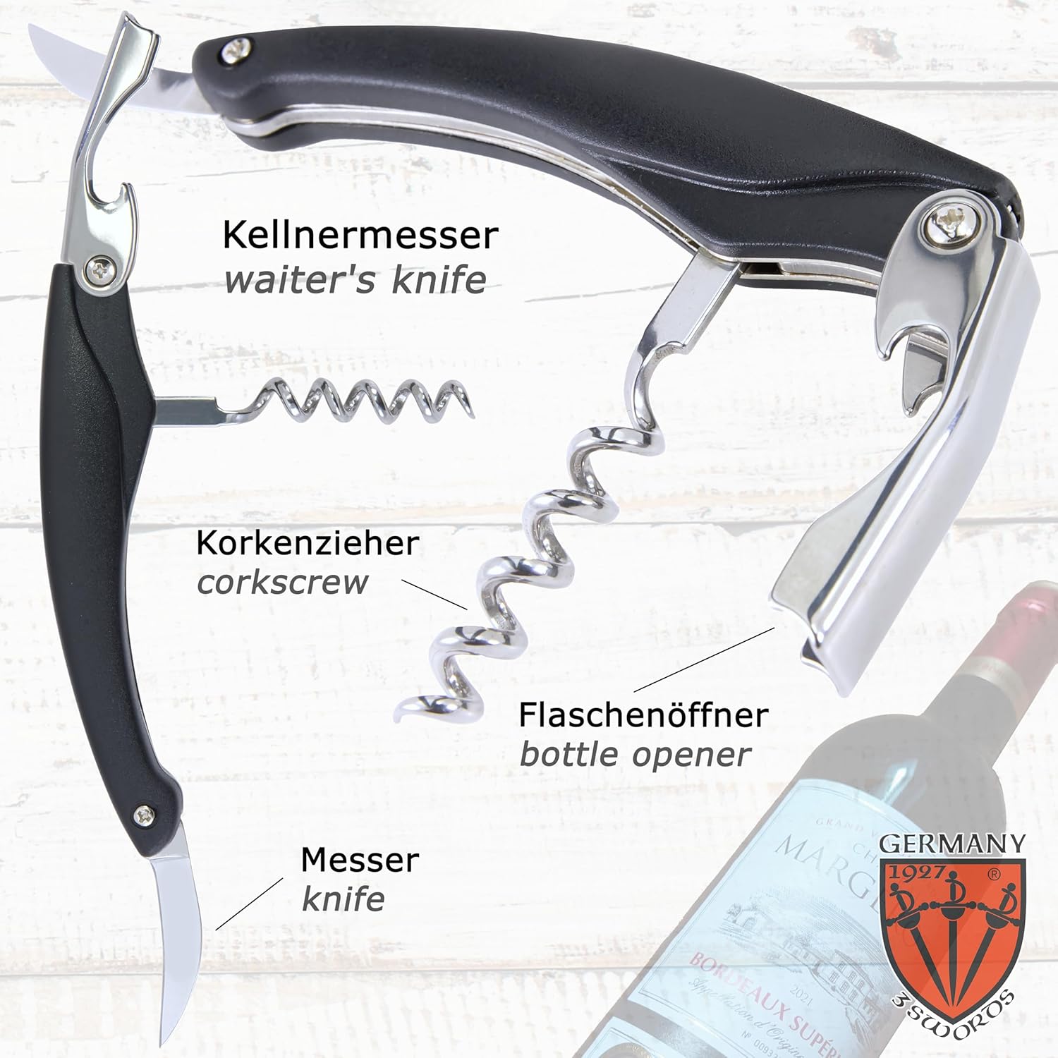 - CONTENTS: Tweezers, bottle opener/foil cutter/corkscrew, nail clipper, toe nail clipper, sapphire nail file.