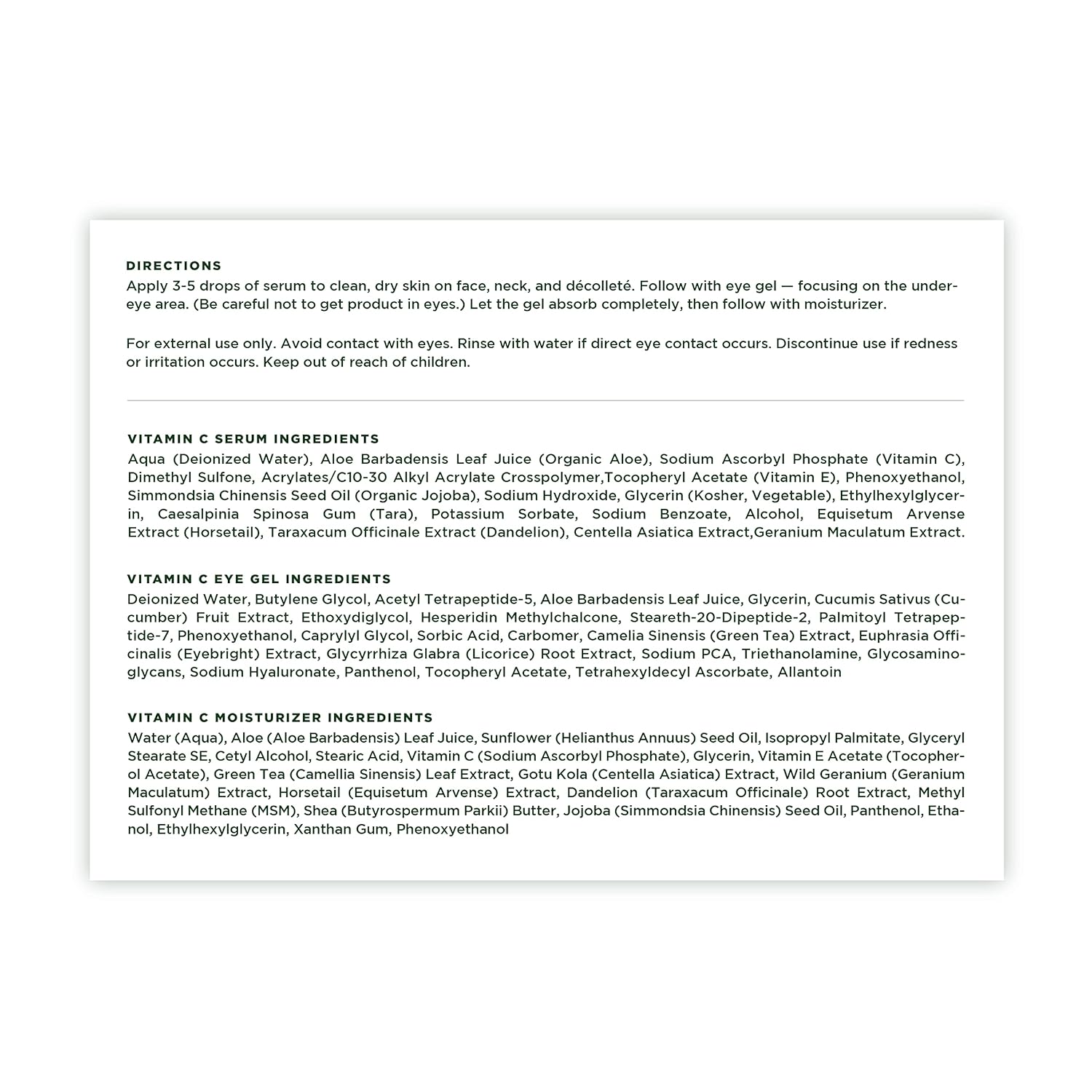 - A soft, glowing complexion awaits. The Vitamin C Serum visibly brightens, reduces the appearance of dark spots, and evens skin tone. Vitamin C Eye Gel diminishes the look of dark circles, puffiness, and fine lines. Vitamin C Moisturizer visibly brightens as it hydrates and softens.