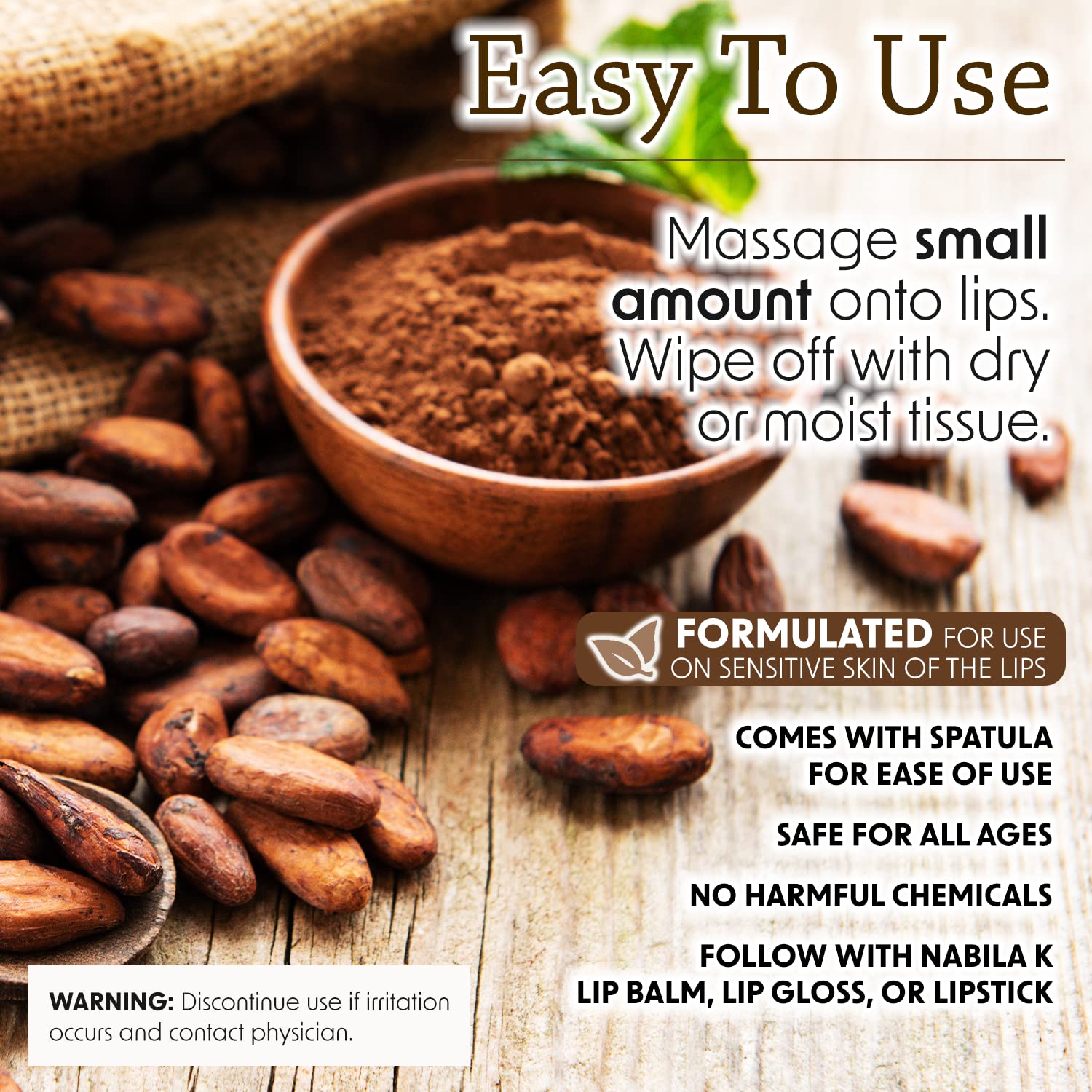 - Healthy, Glowing Lips: Massage a small, pea-sized amount onto your lips with your fingertips until it's mostly dissolved and wipe away any excess. Pair with Nabila K Lip Balm to lock in lip moisture and prevent chapped, dry lips. Use at least twice a week for a noticeable difference in texture and appearance.