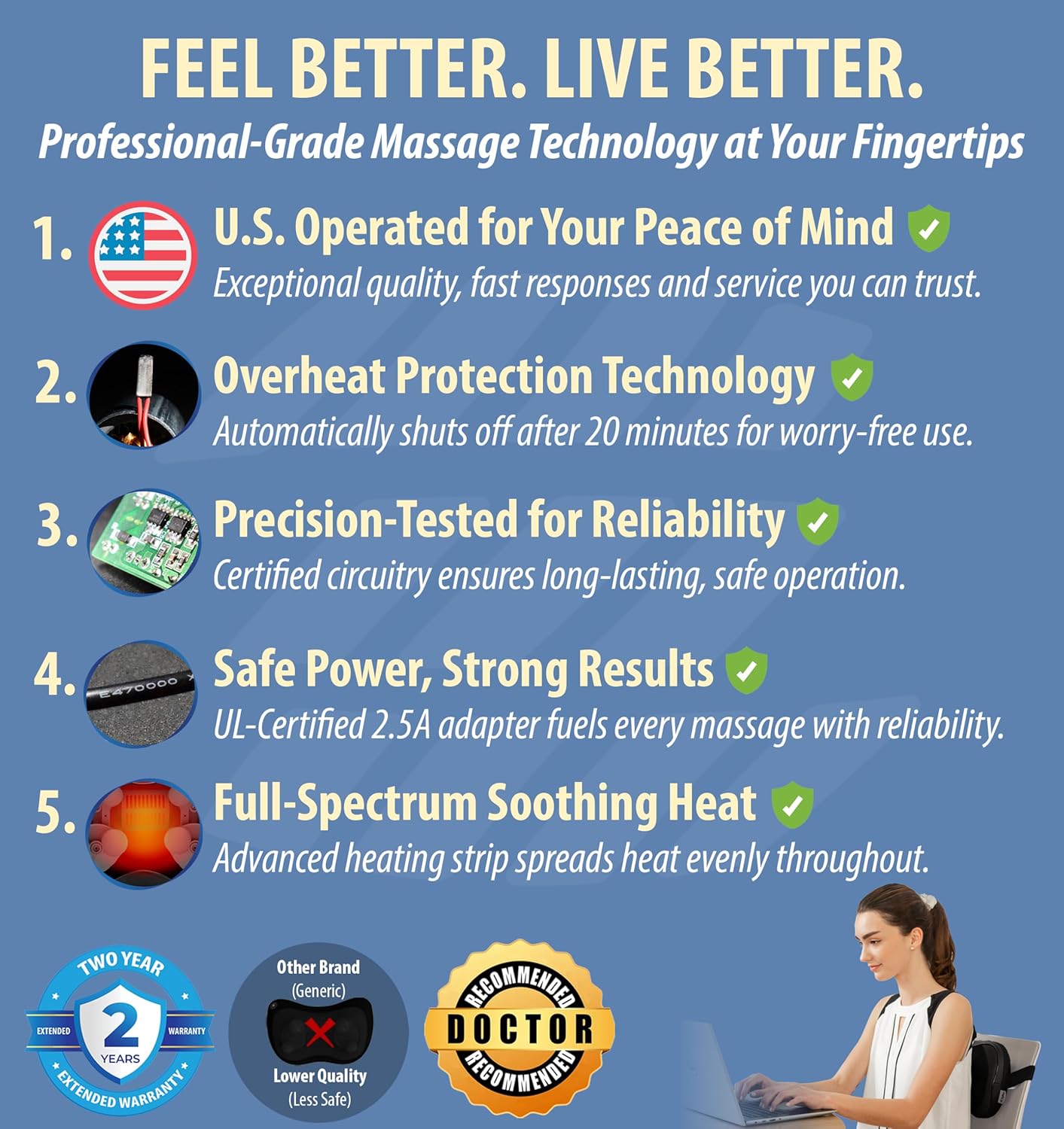 - Tested & Certified: Only top nodes light up red when heat function is on; Overheat protection automatically shuts off the massager after 20 minutes; Each side rotates every minute for safe and balanced comfort relieving muscle aches and spasms