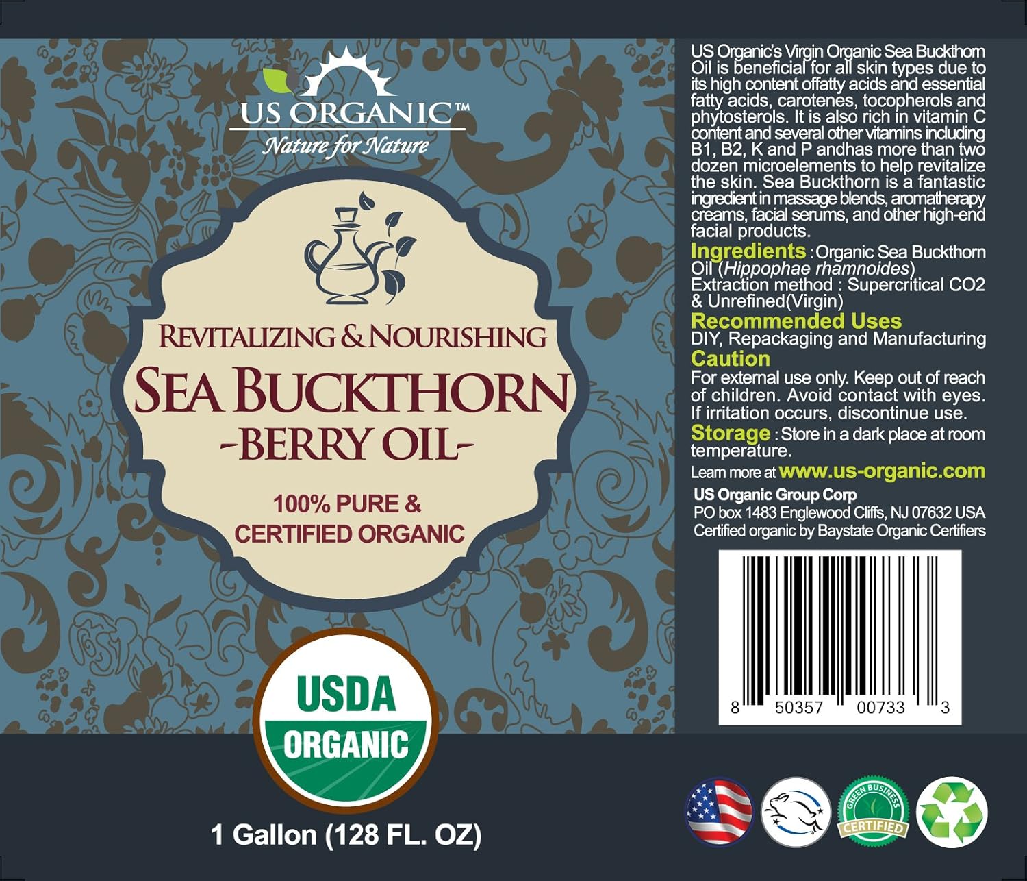 US Organic Sea Buckthorn Berry (Fruit) Oil Bulk pack, USDA Certified Organic,100% Pure & Natural, Supercritical CO2 extracted, Virgin, Unrefined (128 oz (1 Gallon))