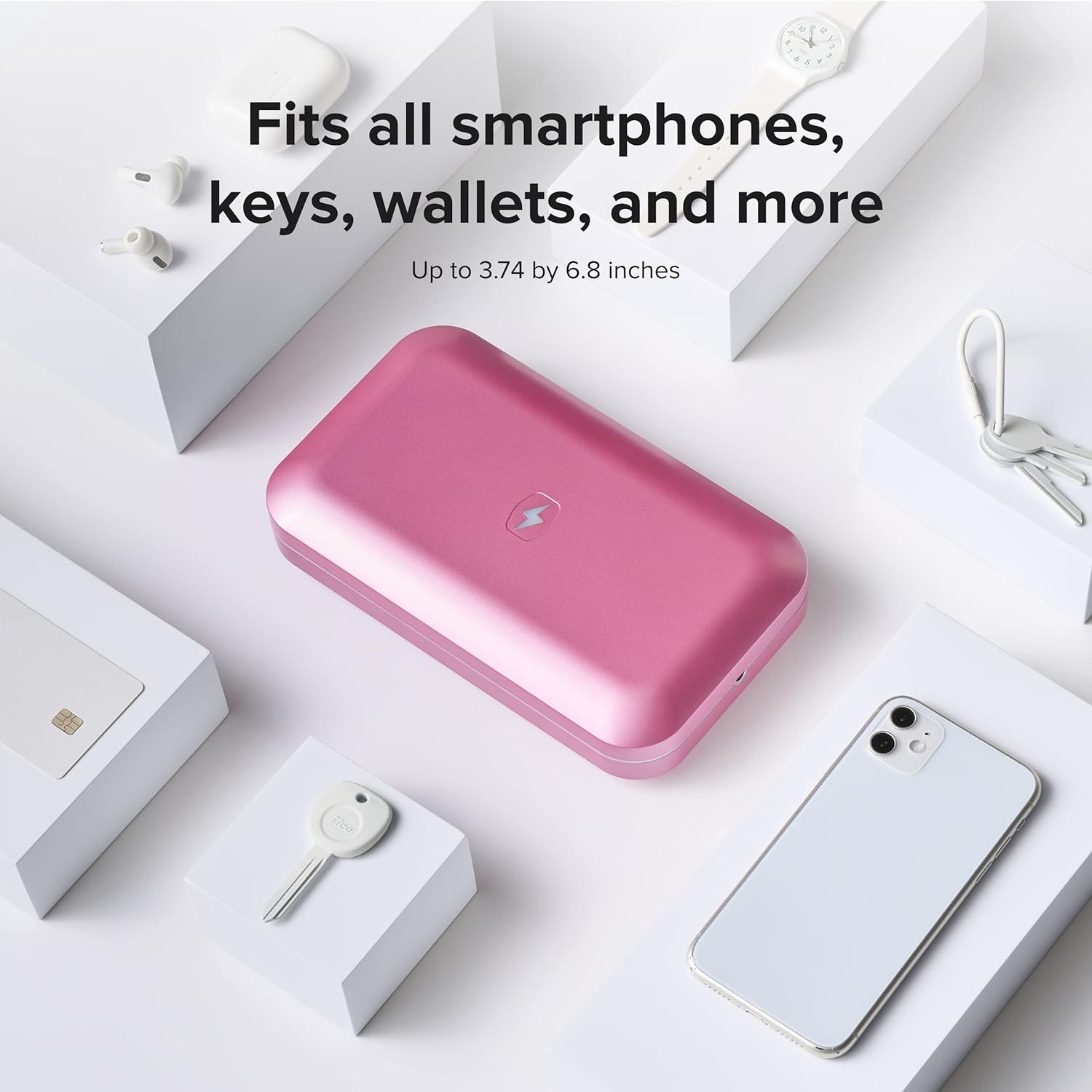 - Disinfects More than Just Phones; The PhoneSoap 3 fits all smart phones - even larger models like the iPhone 8+ or Galaxy S10+ - and can disinfect more than just phones. Add your keys, wallets, headphones, jewelry, glasses, and more. Interior Dimensions: 6.8 x 3.74 x 0.78 in.