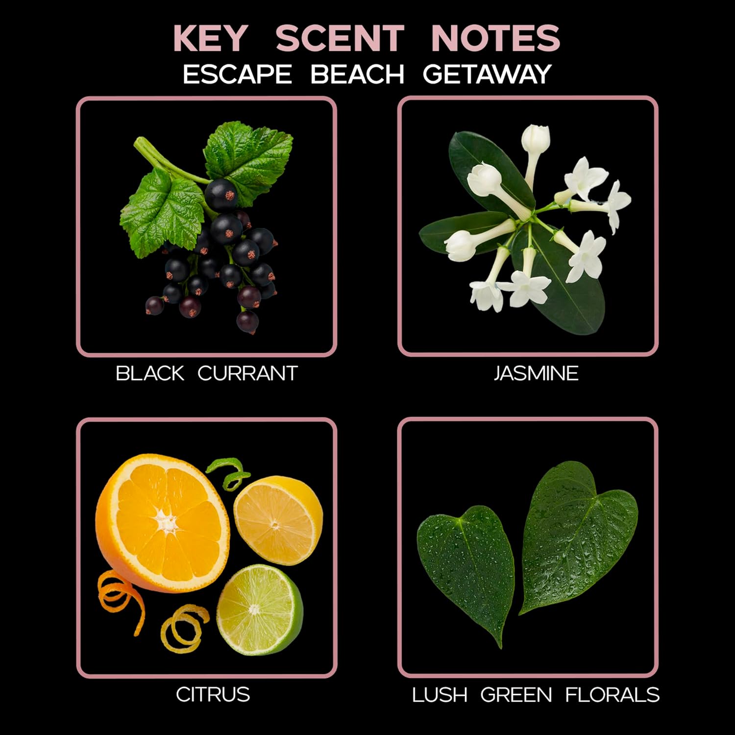 - ESCAPE BEACH GETAWAY – captures a coastal retreat with Lemon, Orange, Black Currant, Geranium, Jasmine, Green Florals, Amber, and Wood; the Bell Diffuser with a white ribbon accent and seashell detailing completes the airy seaside vibe; ideal for white, cream, and soft blue décor.