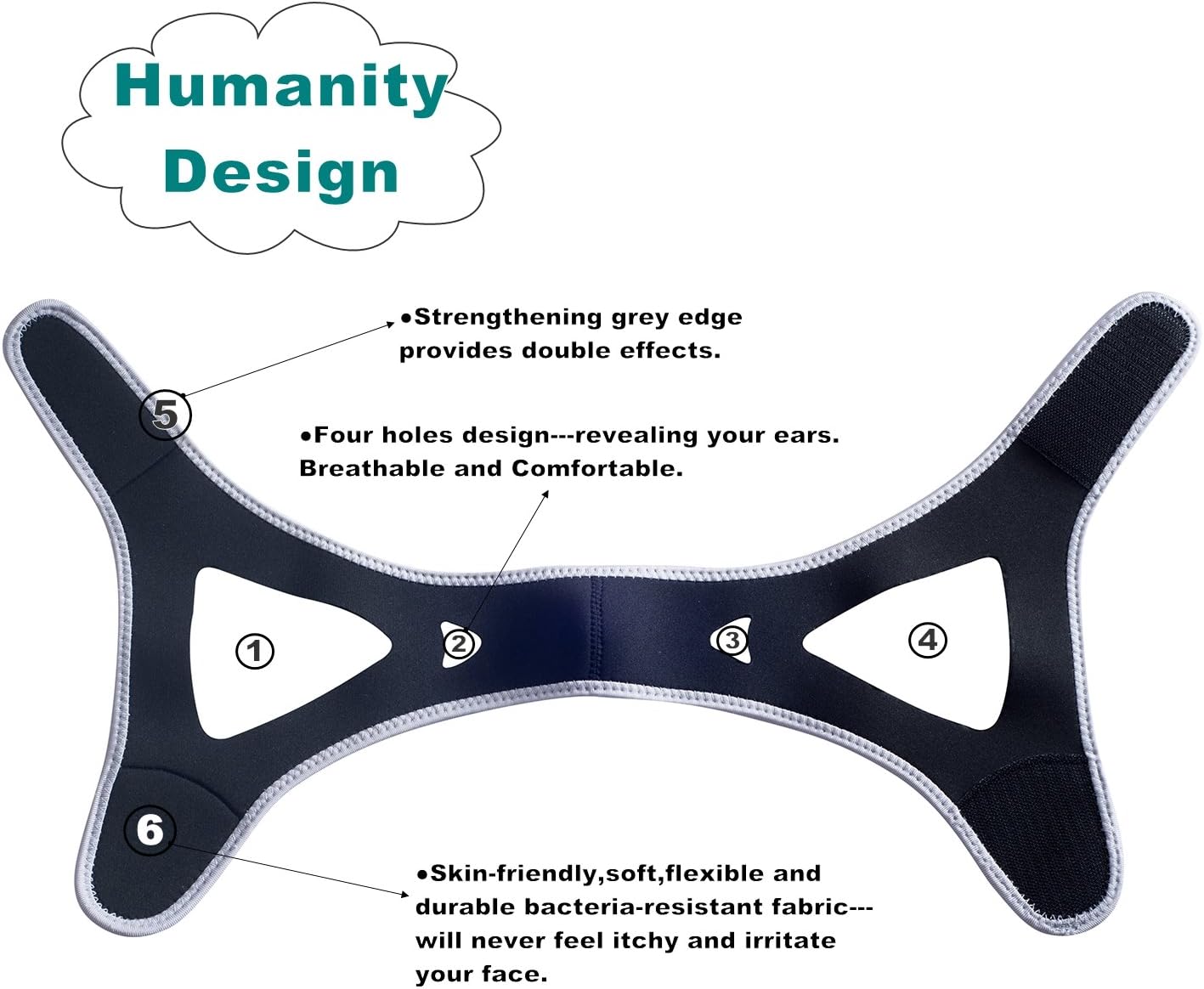 - 2.HUMANITY and SCIENTIFIC DESIGN---●Four fully wide adjustable velcro straps make sure that you can perfectly adjust the size and tension according to your need.●Triangle design can solid fixed throughout the night without sliding off.●Revealing your ears, breathable and not oppressive,giving you more comfort.●Strengthening edge provides better anti-snoring effects.