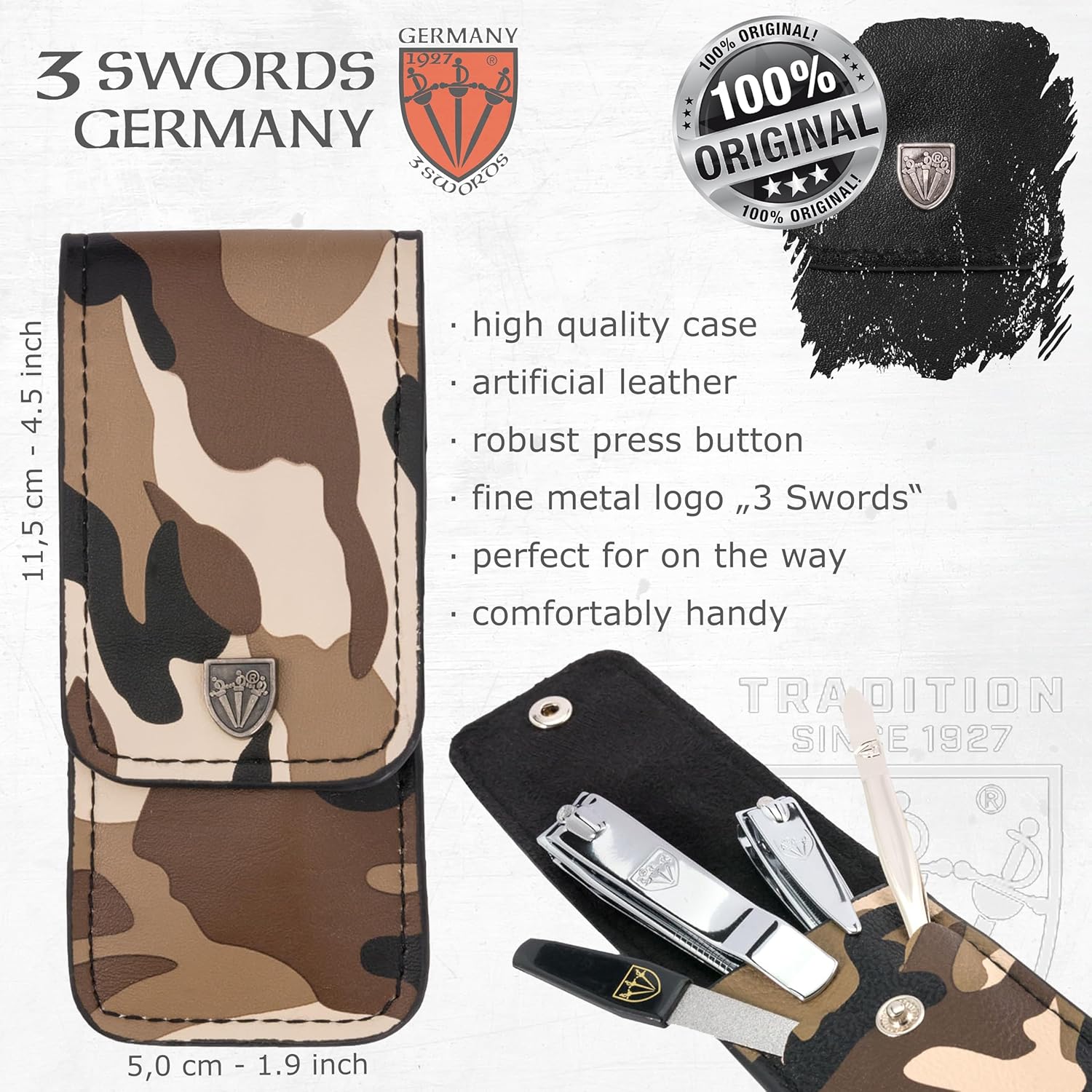 - CASE: Fashion leather camouflage/army look, size ca. 11,0 x 5,0 x 3,0 cm. Our organizers are made of high-grade fashion or classic materials. Additional equipment: Microfiber cleaning cloth for cleaning steel items, general info sheet “Finger - Nail Grooming”.
