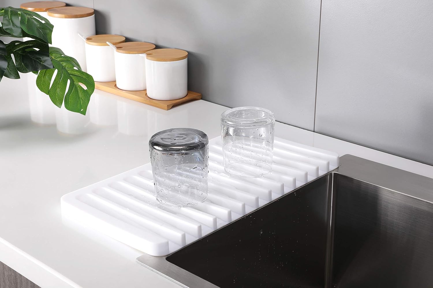 - SPACE SAVING & EASY TO CLEAN- Flexible and non-slip surface protect delicate items like stemware. Dishwasher safe and its size is perfect for kitchens with smaller countertops. Could also be used in addition to your main dish rack, making frequent used items in easy reach. Made of food-safe silicone and dishwasher safe. Dimensions (L x W x H): 15.2" x 7.9" x 0.67".