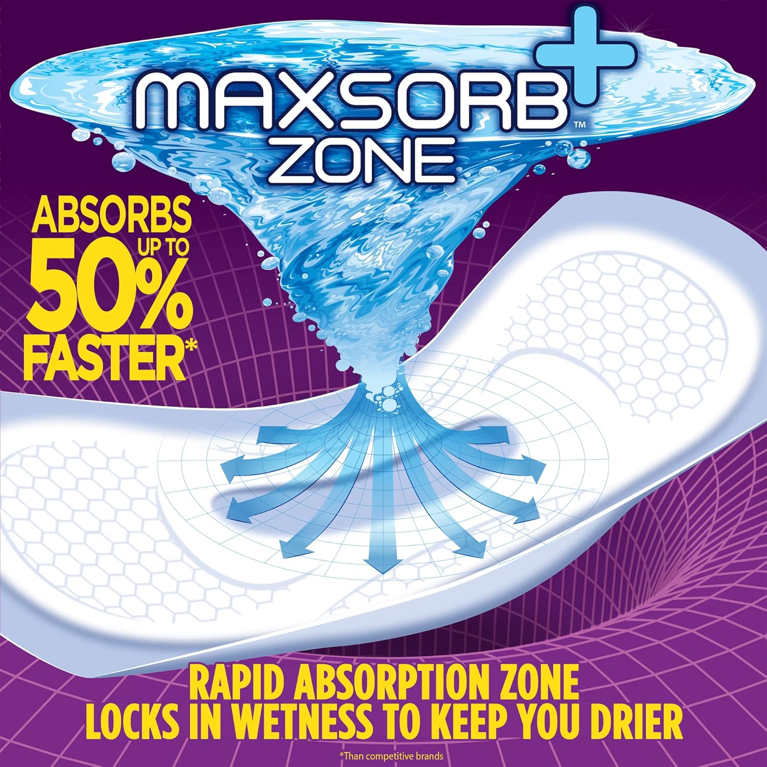 - DRY & ODOR FREE: A discreet MaxSorb Gel core locks in wetness & keeps you 10X drier than maxi pads, & Omni-Odor Guard neutralizes odors instantly. They're ideal for use during the day or overnight.