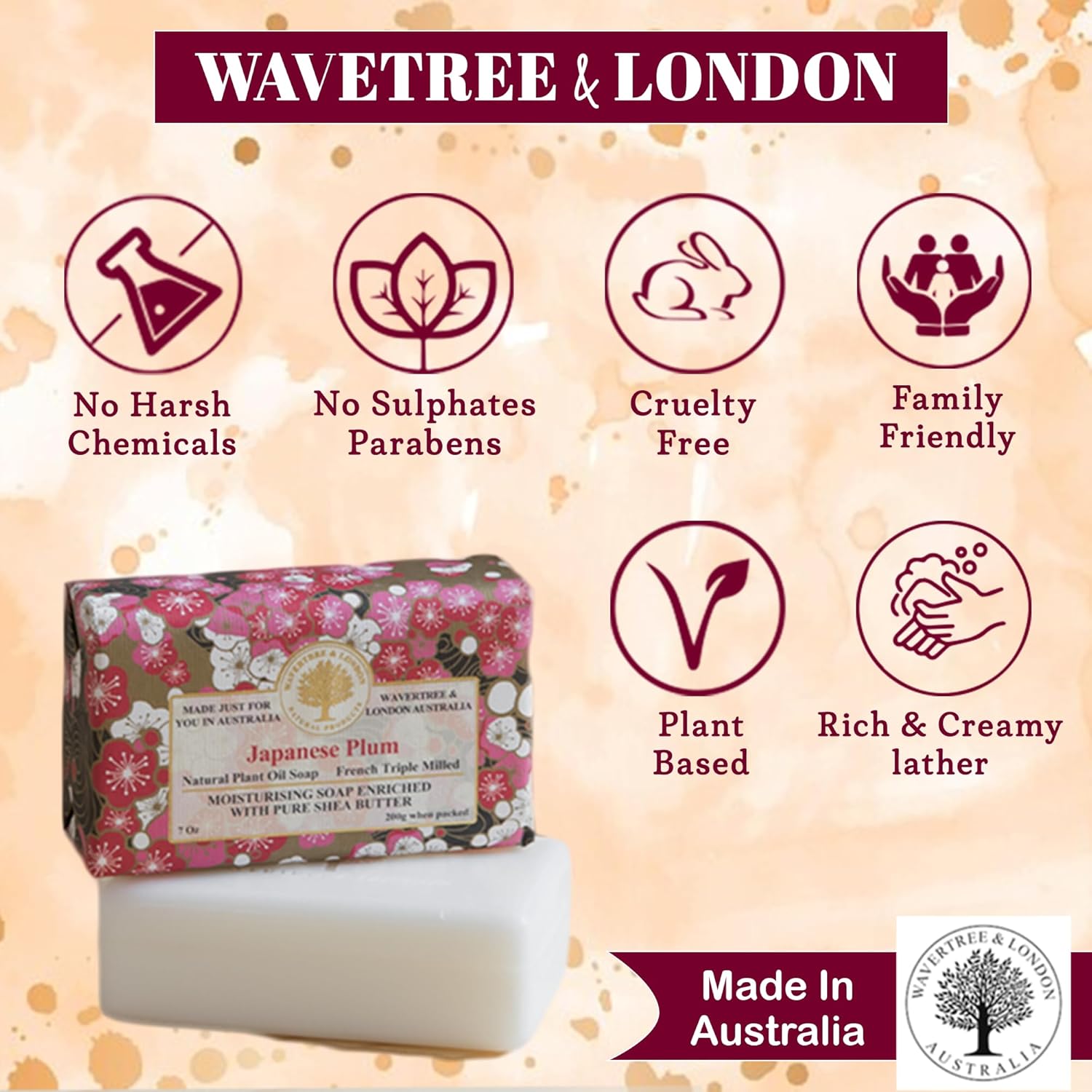 Wavertree & London Japanese Plum Scented Natural Soap (8 Bars), 7oz Moisturizing French Triple Milled Soap Bars enriched with shea butter - Pure Plant Oil Bath & Body Bars for All Skin Types