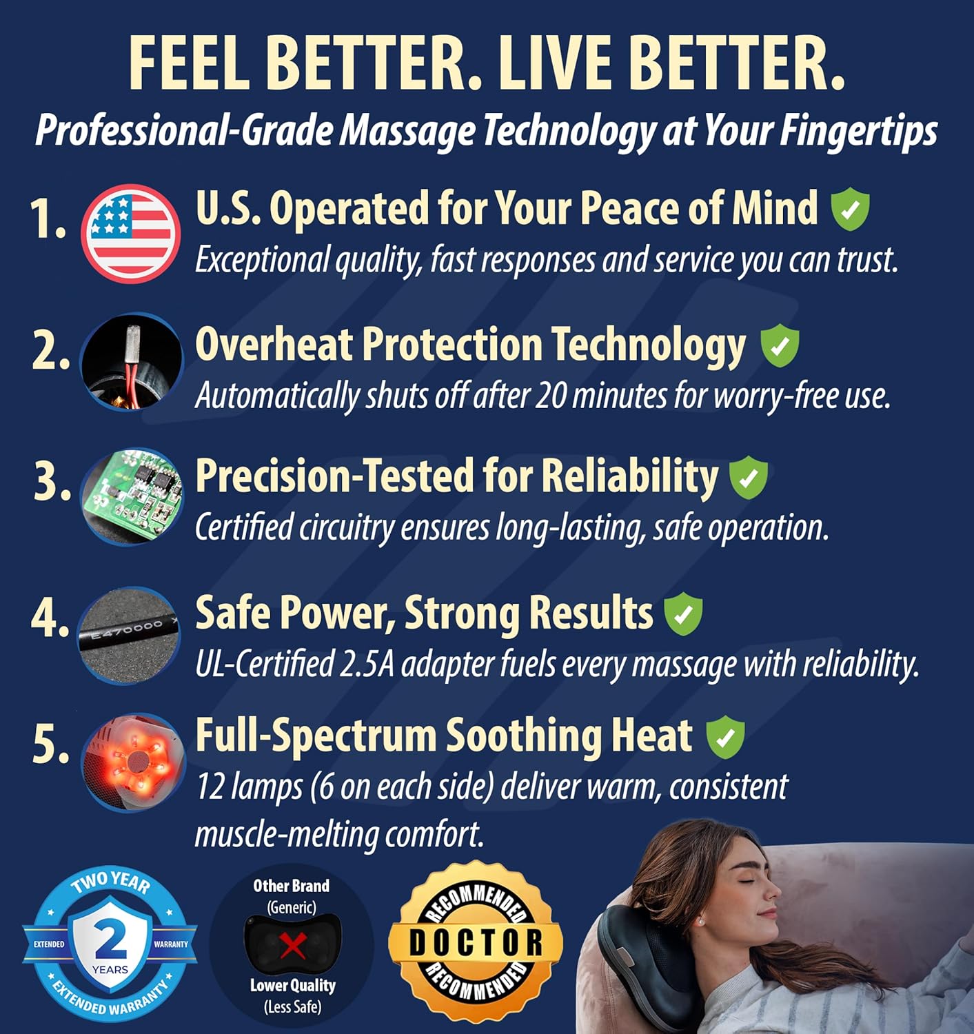 - Tested & Certified: With safety in mind, overheat protection automatically shuts off the back massager after 20 minutes; Each side rotates every minute at a single speed, for safe and balanced comfort to help relieve muscle aches and spasms