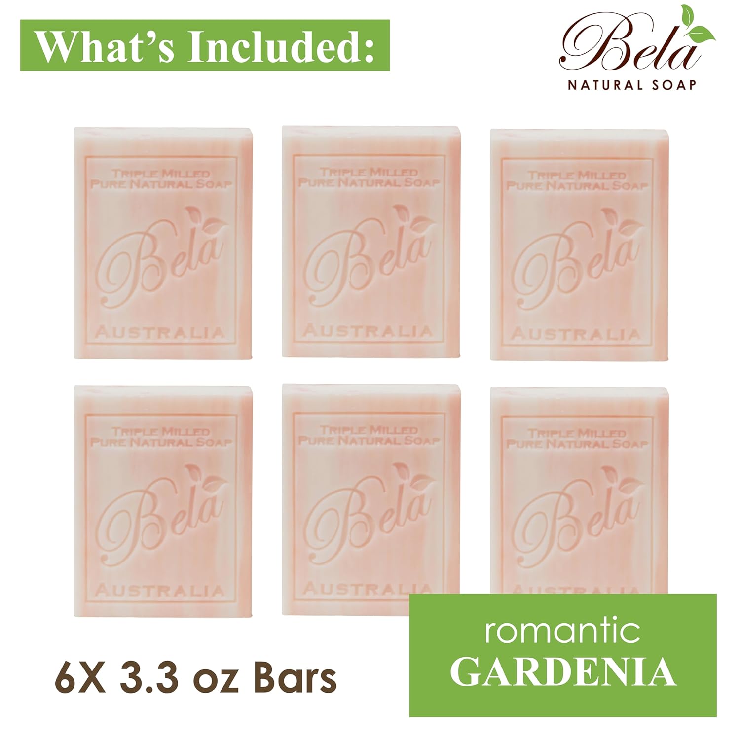 BELA Romantic Gardenia Soap 3.3 OZ Pack of 6, Long Lasting French Triple Milled Bar Soap with Organic Shea Butter Hand, Face and Body Wash Bar, Made in Australia