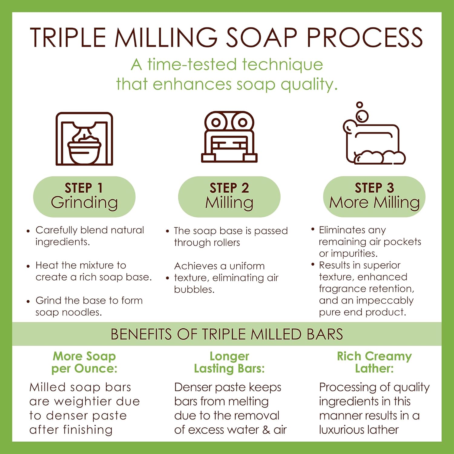 - Rich, Creamy Lather: Our triple milled soap is refined for purity and smoothness. Silky smooth and free of impurities, this shea butter bar soap produces a rich lather and pleasant fragrance that lasts until the final sliver is gone.