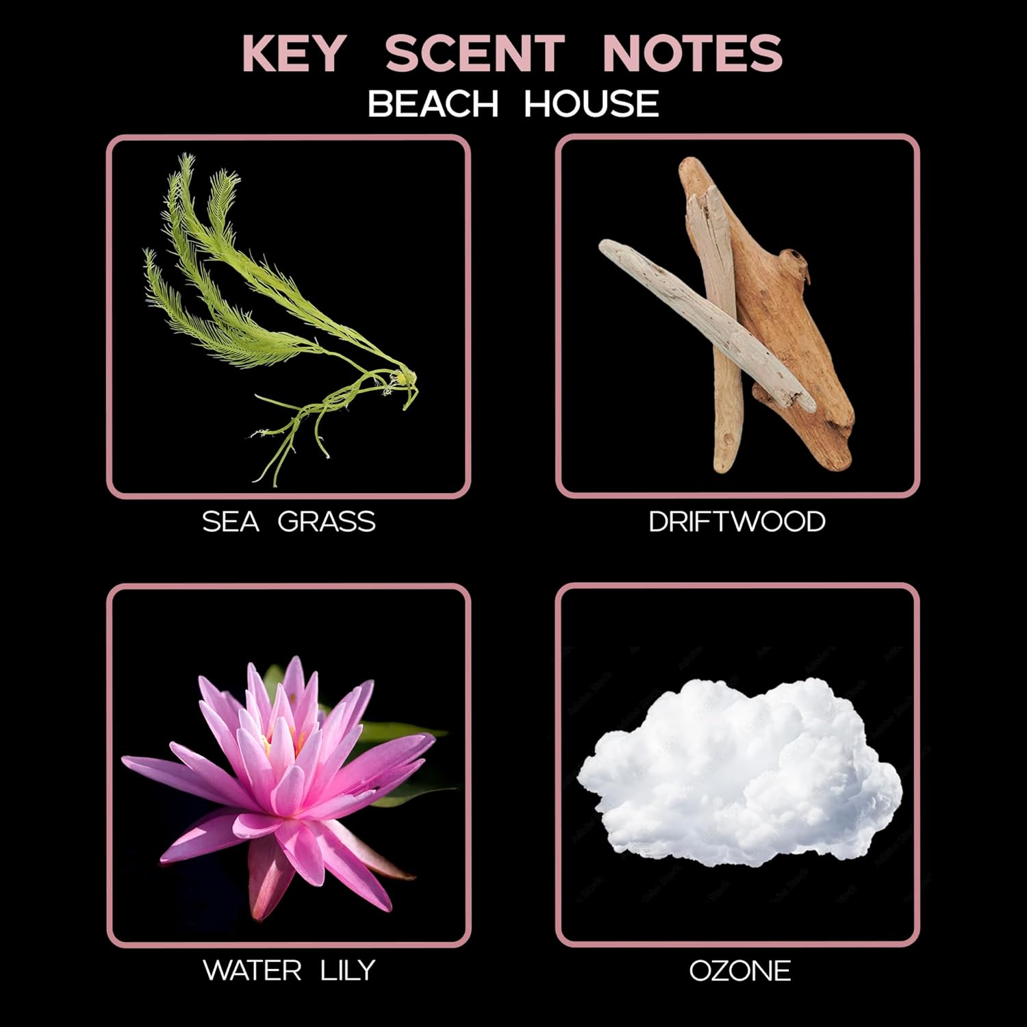 - BEACH HOUSE – smells like a breezy coastal escape with Sea Grass, Sand, Summer Sky, and Ocean; showcased in our Infinity Diffuser, a contemporary flat round glass bottle with a slender neck that playfully echoes a lollipop shape, topped with a navy sheer ribbon accent for a refined, timeless look and finished with real seashells; perfect for deep blue, indigo, and coastal décor.