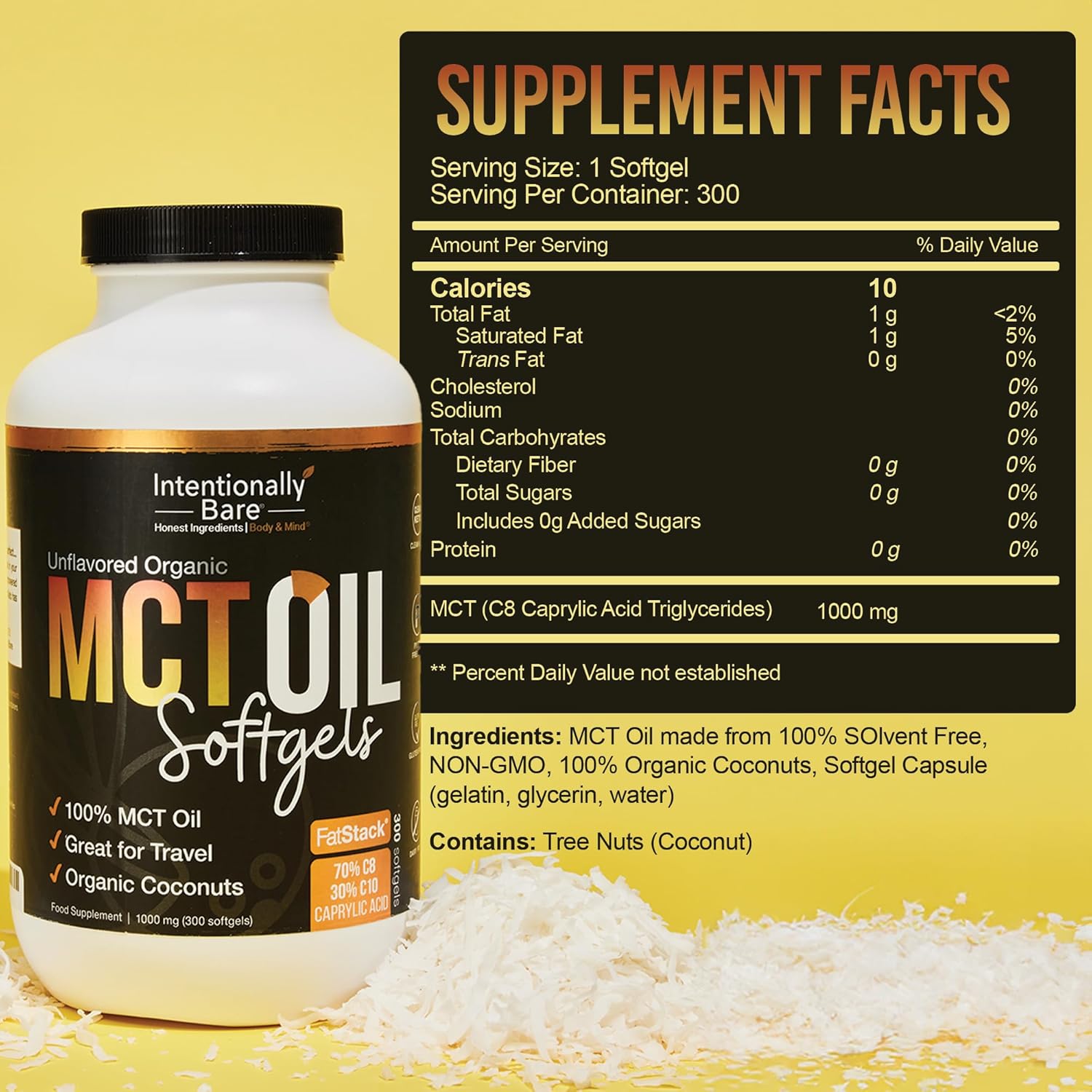 Intentionally Bare Organic MCT Oil Capsules - 70% C8 MCT Oil & 30% C10 MCT Capsules Unflavored for Keto Low Carb and Paleo Diet - Coconut C8 & C10 for Energy Mood & Focus - Non-GMO 300 Soft Gels