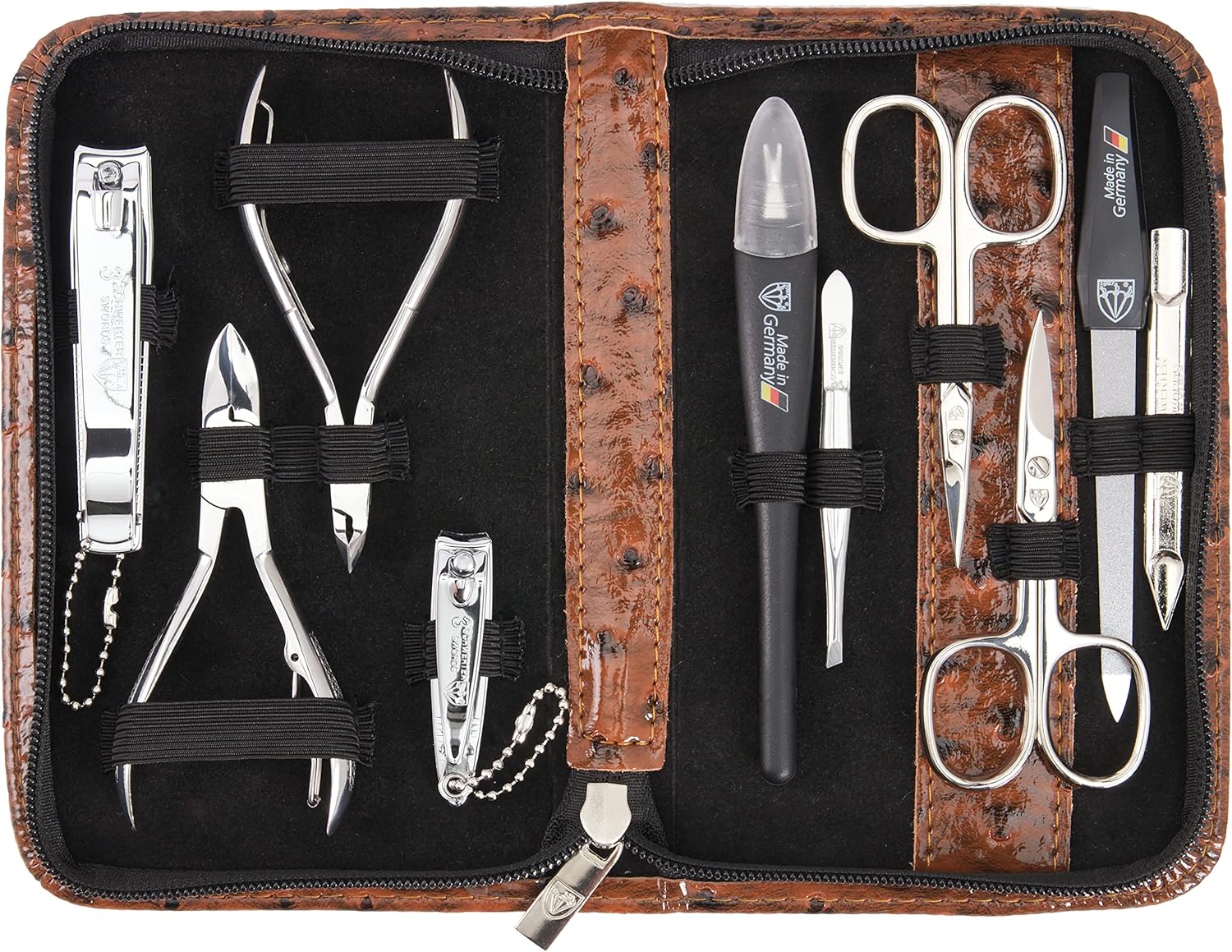 - CASE: Fashion leather ostrich brown, size ca. 18,0 x 11,0 x 2,5 cm. Our organizers are made of high-grade fashion or classic materials. Additional equipment: Microfiber cleaning cloth for cleaning steel items, general info sheet “Finger - Nail Grooming”.