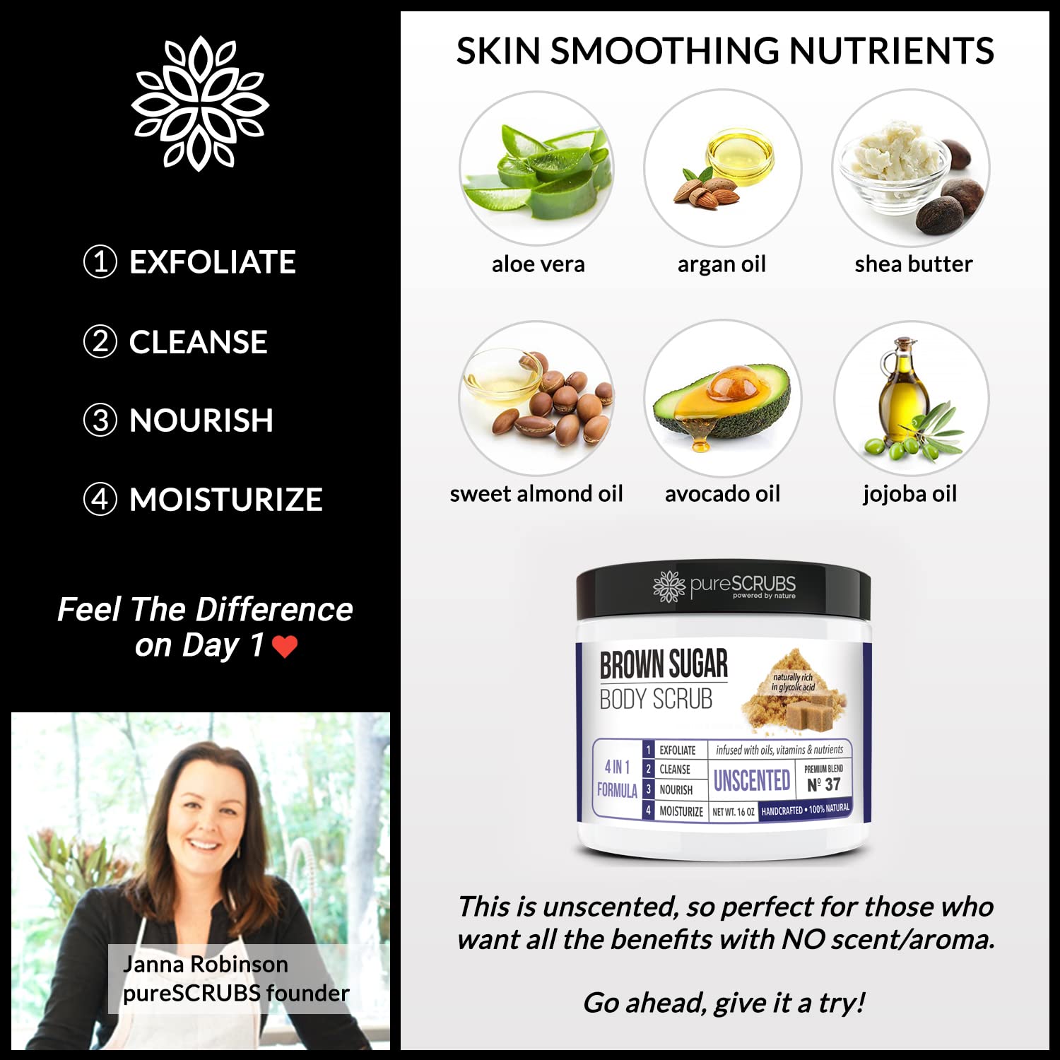 - GET ULTRA SMOOTH SKIN FAST - THIS WORKS! Our unique “4 in 1 Formula” does everything a body scrub should do and more. Pure brown sugar crystals infused with essential oils, nutrients and skin softeners helps to smooth away rough, bumpy, and uneven textures to instantly reveal your true soft, healthy and radiant skin. This is formulated to be an unscented scrub, perfect for those with sensitive noses. The only aroma is from the natural, raw ingredients themselves.