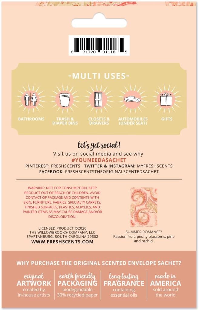 Willowbrook | Fresh Scents Scented Sachet Packet | Summer Romance | Air Freshener Bags for Drawers, Closets, Cars | 6 Pack | Long Lasting Home Fragrance