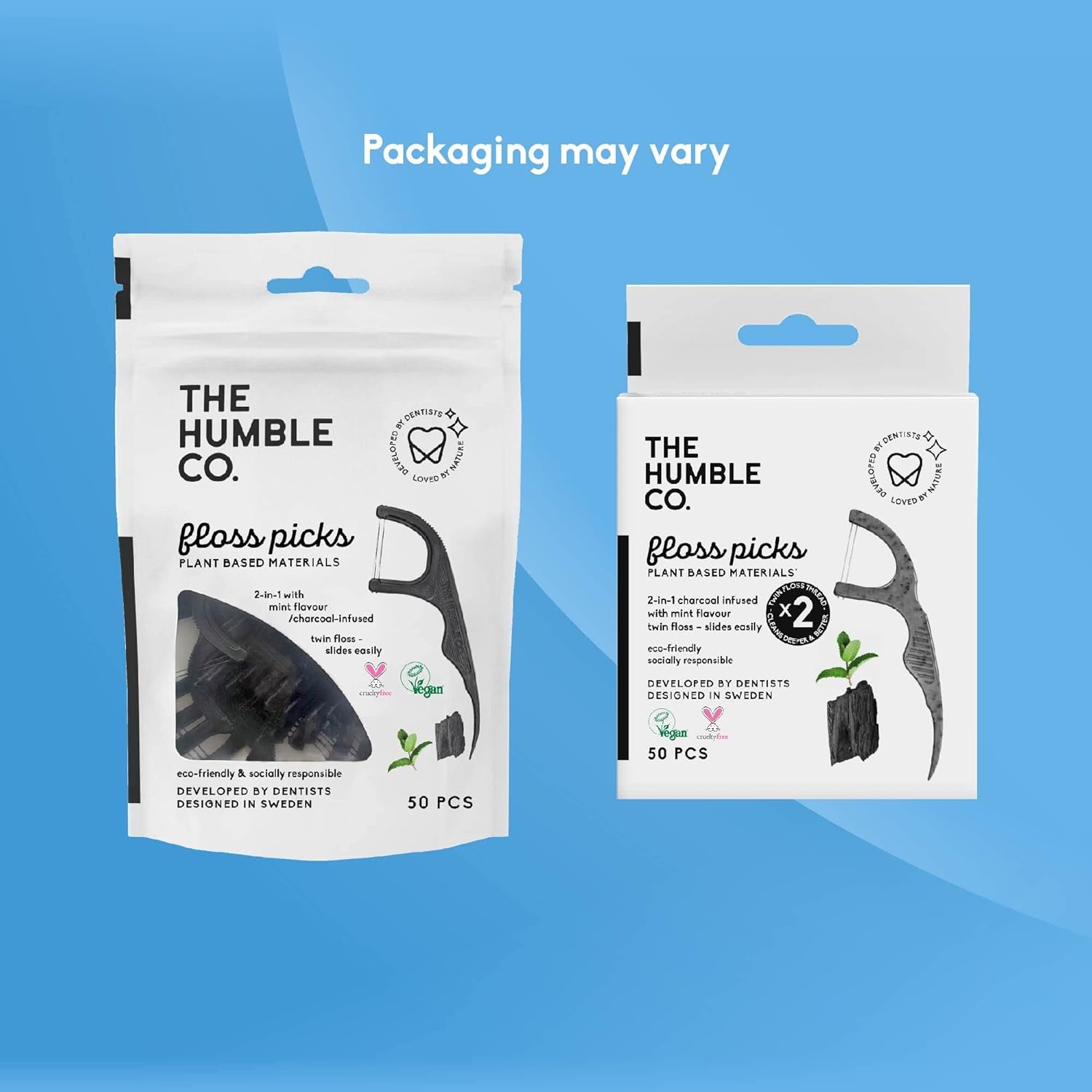 The Humble Co. Floss Picks (200 Count) – Plant Based Dental Floss Picks for Superior Oral Care, Dental Hygiene, and Gum Health, Cruelty Free Tooth Floss Picks (Charcoal, Double Thread)