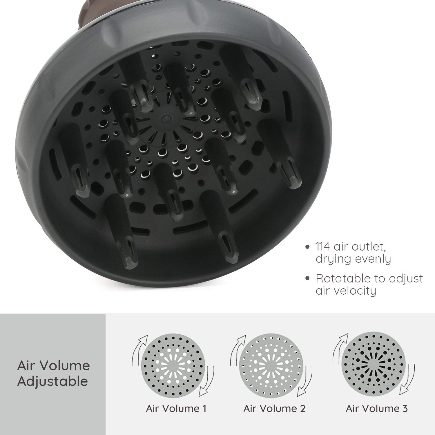 - Adjustable Air Flow: 114 air outlets and multiple teeth ensure even distribution of heat, protecting your hair from the damage of concentrated heat and unwanted frizz and dryness. Simply spin the base of this diffuser to change the air flow. Easy to achieve voluminous and shiny hair without over-drying them