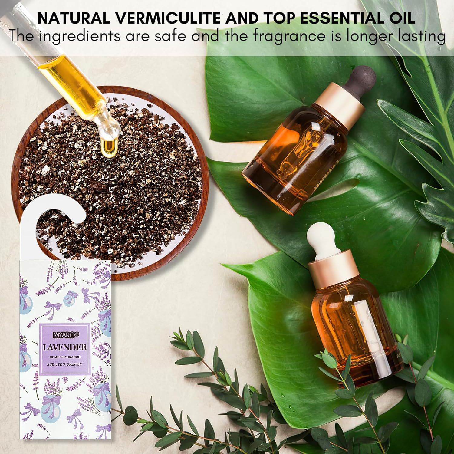 - MYARO 12 packs Scented Sachets for Drawer and Closet - Large sachets fill your home with fragrance. These large sachet bags have more essential oils added to it than the small, making the room freshener dissipate well and last longer. Lavender essential oil fragrance is infused into the sachet, and the sachet bag releases the scent for you to enjoy