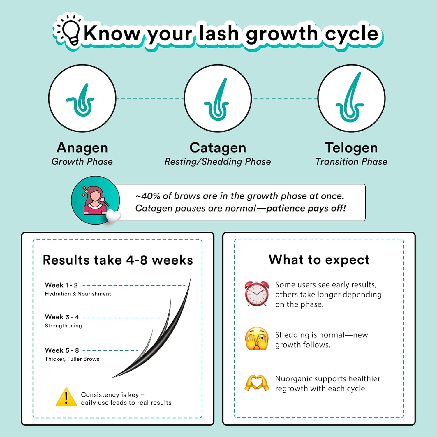 - World Leading Science, Made In The USA — All NuOrganic beauty products are developed by leading scientists and cosmetologists in the USA in our own laboratory, to the highest possible standards. What’s more, they are cruelty free, and contain no nasty chemicals or toxins. Trusted by customers worldwide looking for an effective eyebrows growth serum or premium eyebrow thickening serum