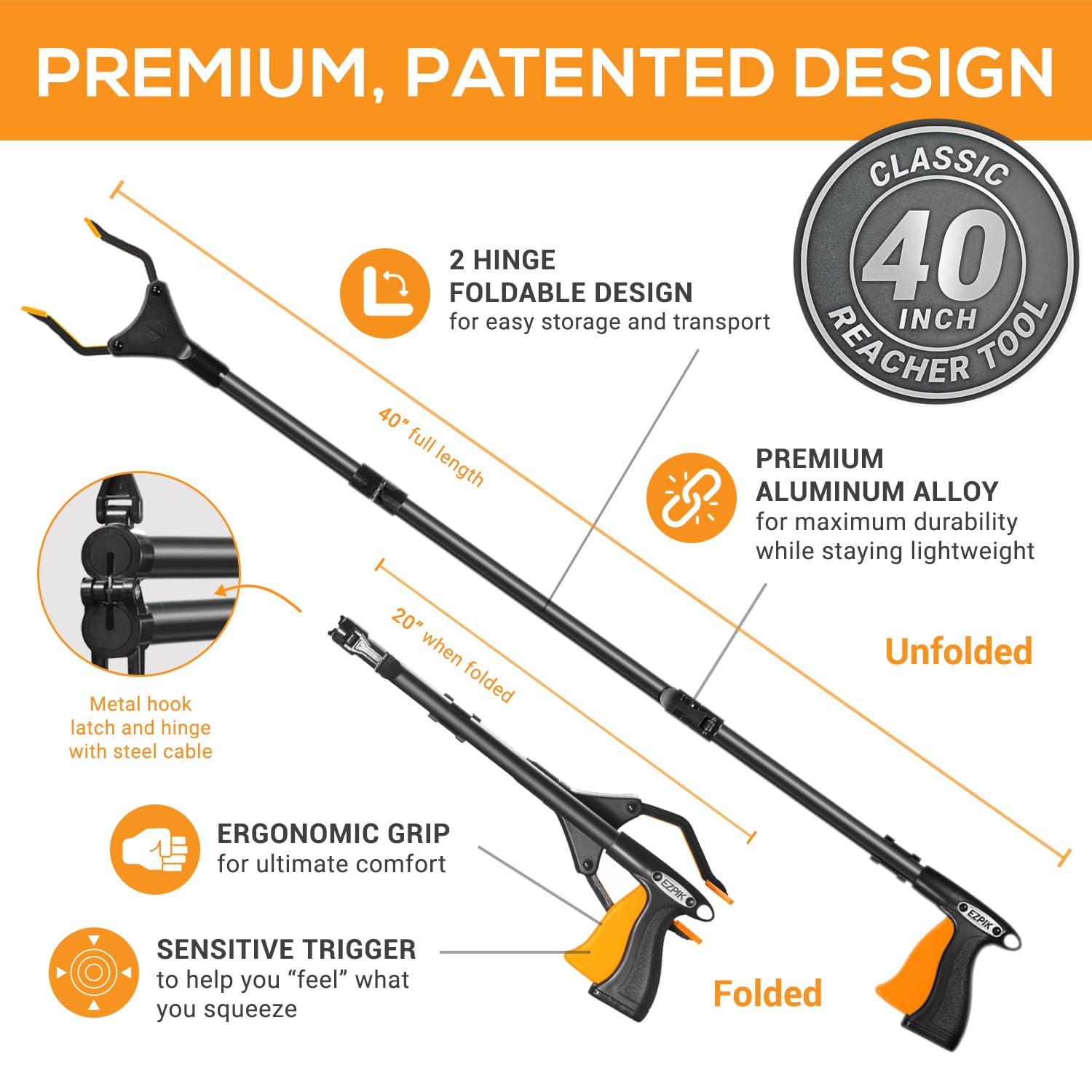 EZPIK Classic 40" Flexible Folding Grabber Tool for Elderly + Magnets, Reacher for Disabled & Seniors Heavy Duty Rotating Grippers for Reaching Underneath, Trash Grabbers & Pickers for Mobility