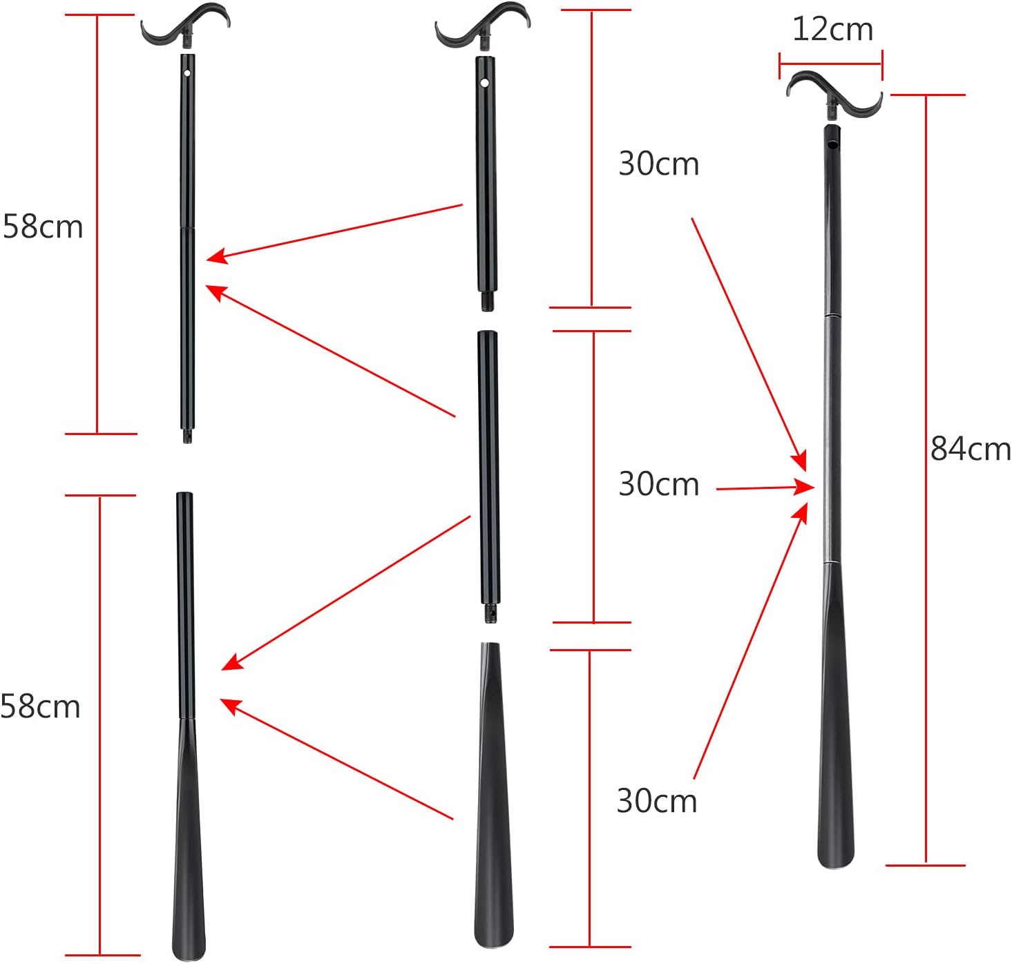 - 【Multifunction Long Handled Shoe Horn】 - Medical Supply Dressing Stick with Shoe Horn with Sock and shoe Remover Tool;Extended Reach Assist.Extendable dressing aid with shoe horn makes getting dressed easier from head to toe. Shoe horn on one end helps guide your heel into shoes, boots and slippers, saving you from bending and reaching. Opposite end features dressing hooks that help you pull on socks, shoes, pants and tops without straining.Easy-to-use sock assist tool makes dressing easier.