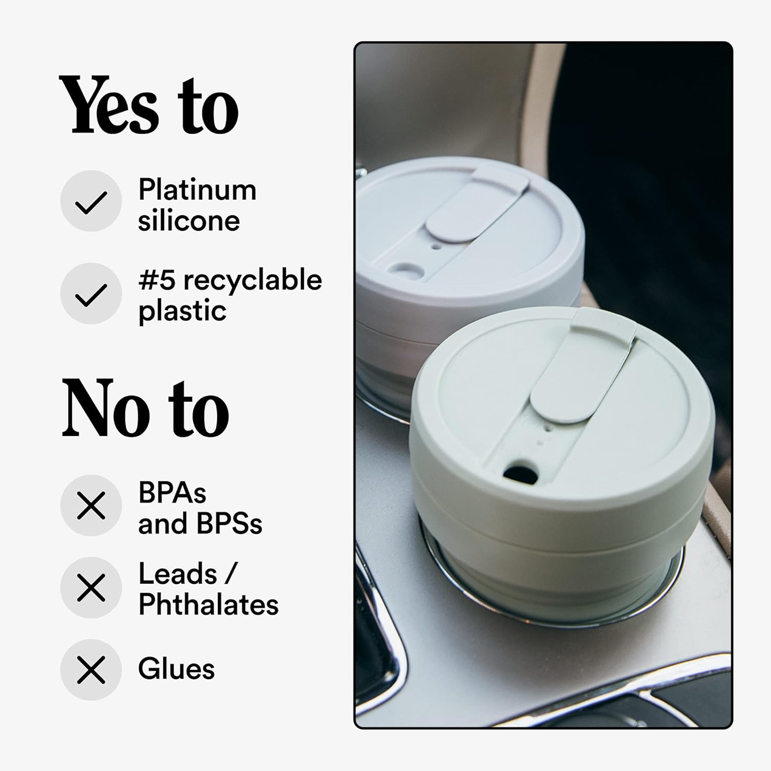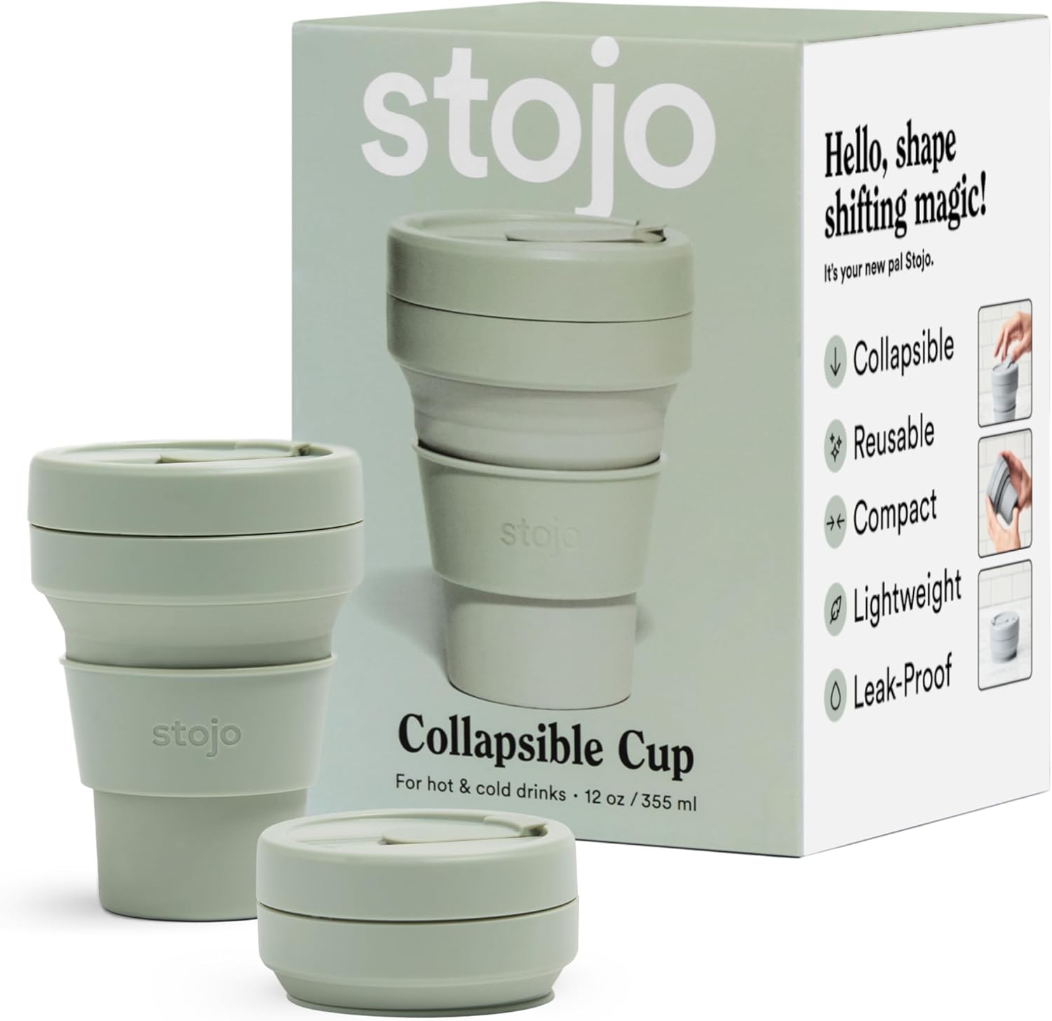 - Collapsible cup: It’s literally never been easier (or more fun) to bring your own reusable cup! This compact cup collapses down to just 2 inches. Whether you’re sipping coffee or a smoothie, the 12 oz Stojo is perfectly portable for your commute, camping trips, tea at home, and travels. When you’re done, simply remove the heat sleeve, open the tab, and collapse it down. Leak-proof, includes a straw, fits standard cupholders, and get a load of that Aquamarine Blue color!