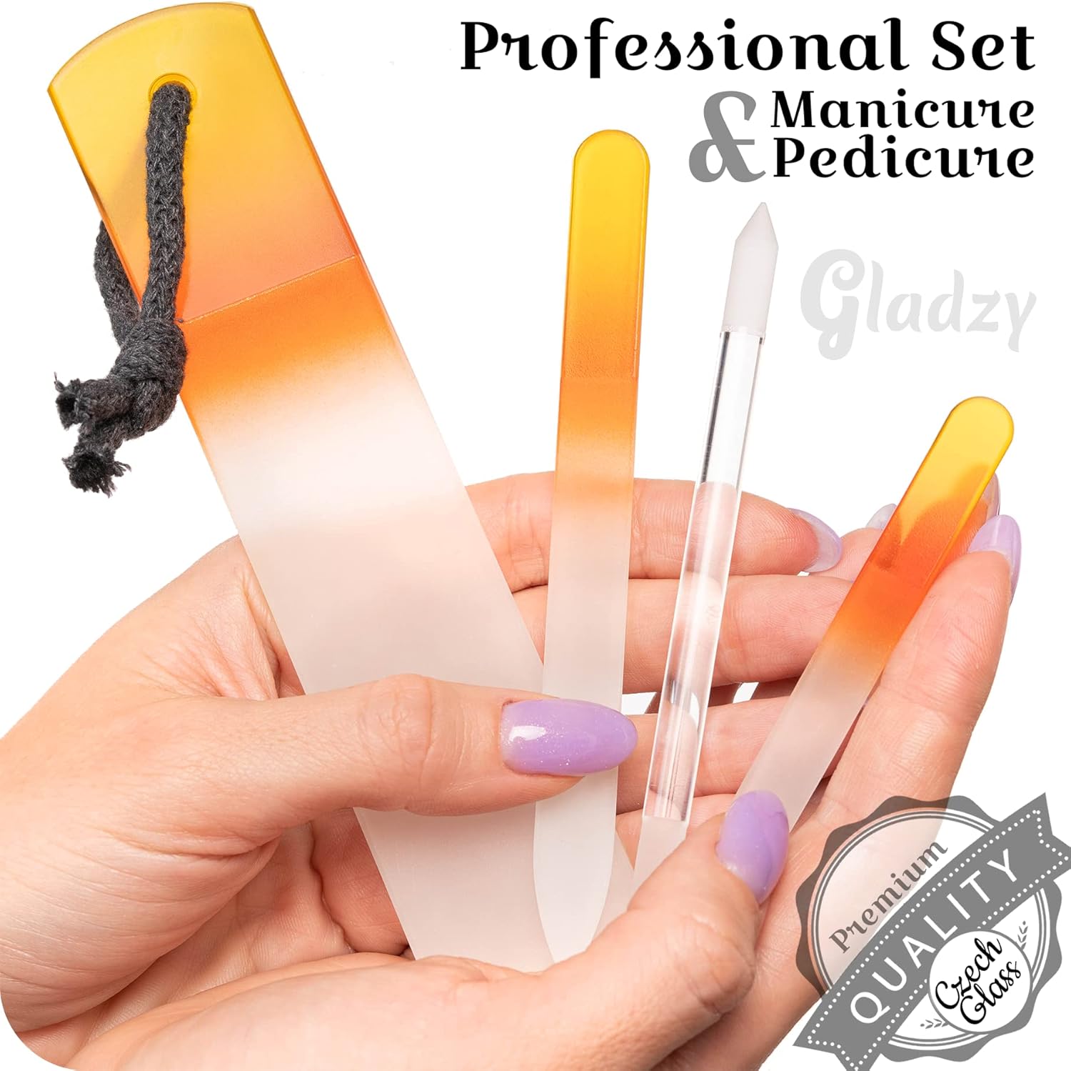 GLADZY Genuine Czech Glass Nail File Set - Callus Remover Foot Rasp, Cuticle Pusher Manicure Stick, Double Sided Etched Different Grit Surface, Professional Nail Care Tool, Made in EU