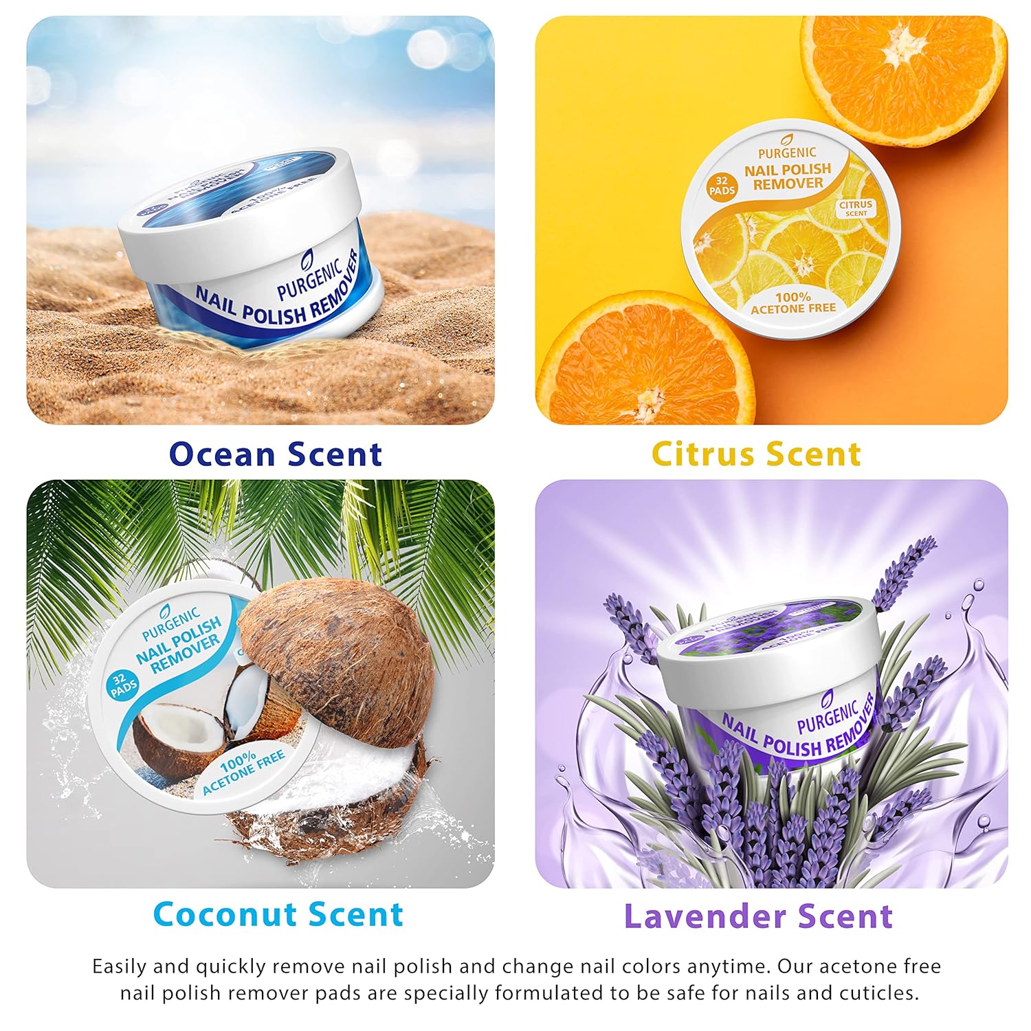 - NO HARSH ODOR: Don’t subject yourself and others to the harsh odors that accompany a traditional nail polish remover. Our non-acetone nail polish remover comes in four delightful fragrances: Coconut, Lavender, Citrus or Ocean!