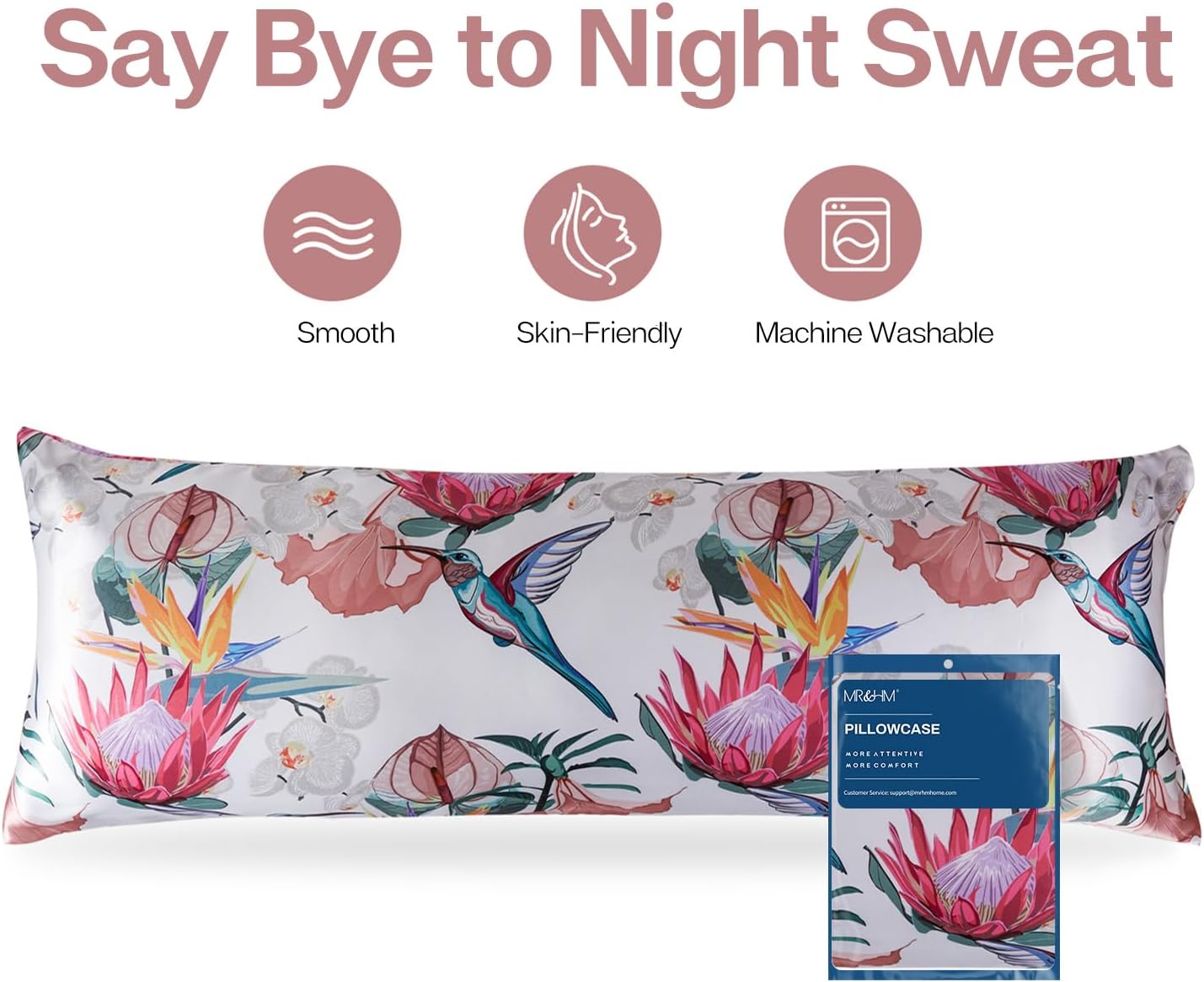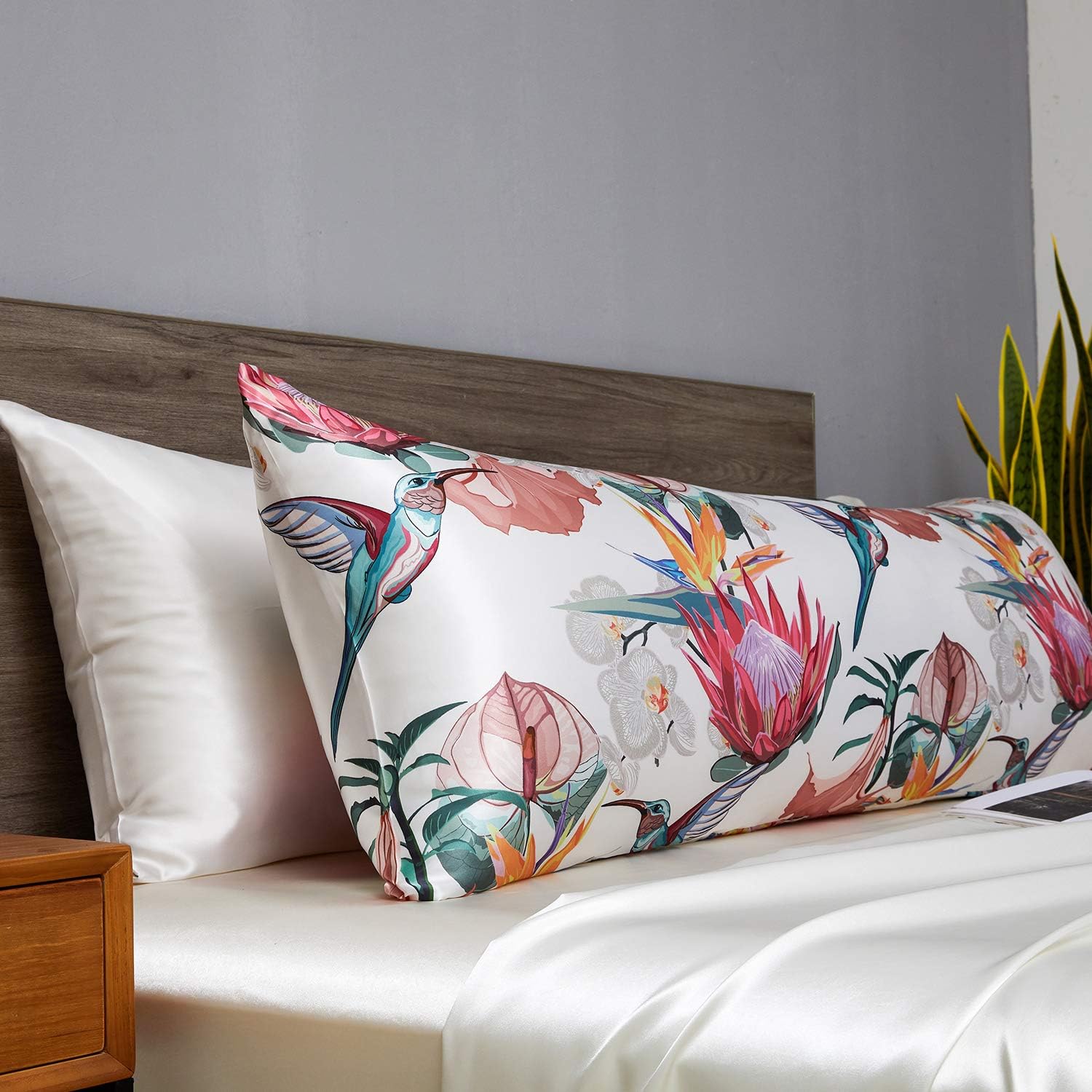 MR&HM Satin Body Pillow Cover, Soft and Breathable Body Pillow Case with Envelope Closure, Cooling and Silky Long Pillowcase for Hair and Skin,Grey (20x54, Floral Bird)