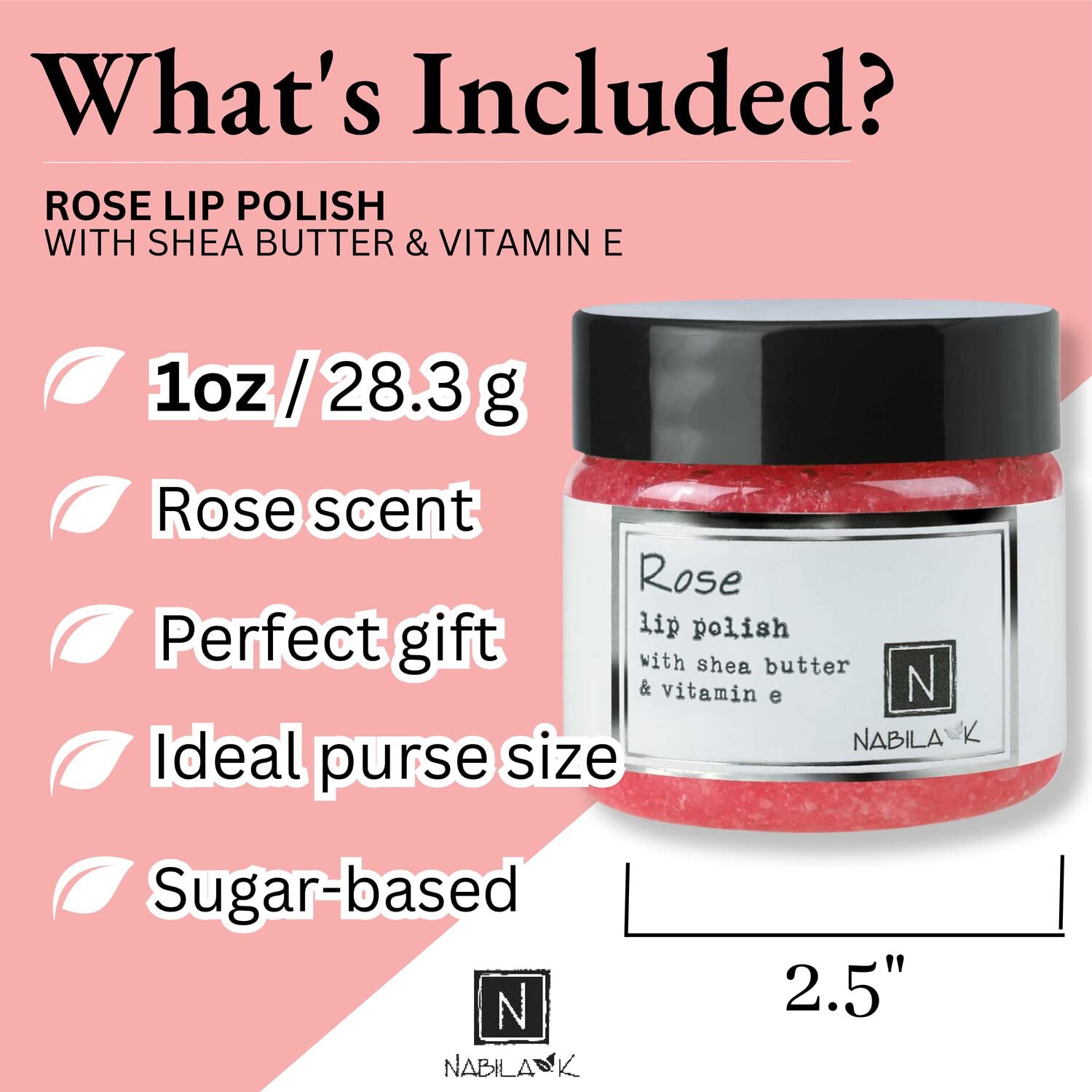 Rose Lip Polish, 1 oz by Nabila K - Hydrating Lip Exfoliator & Moisturizer with Shea Butter and Vitamin E for Dry and Chapped Lips - Cruelty-Free, Real Sugar, Made in USA