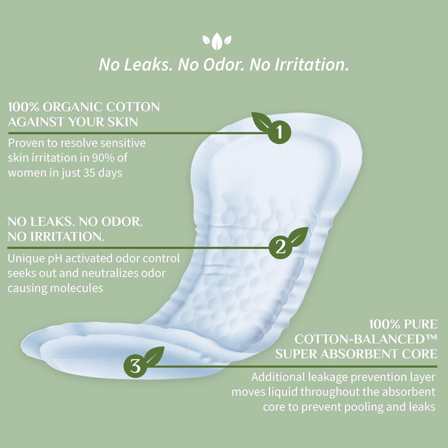 - 100% ORGANIC COTTON next to you and inside to absorb - Organyc Cotton Pads for Bladder Leaks help protect you from odor, wetness, and skin irritation with a cotton-balanced absorbency that pulls away moisture.