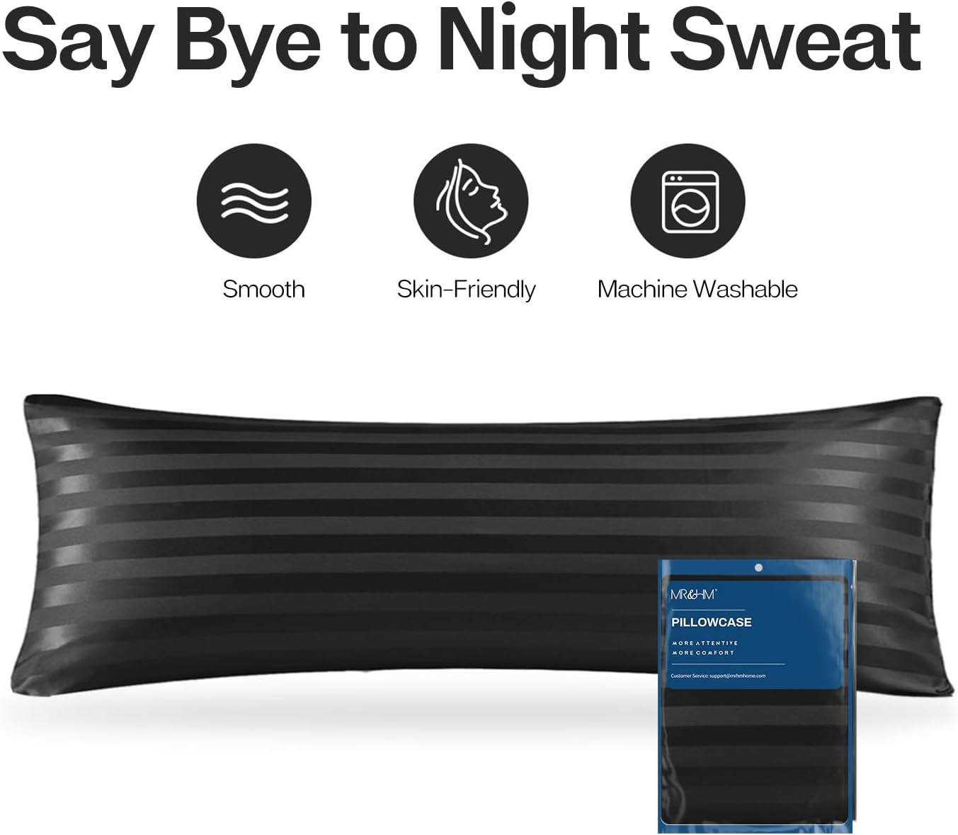 MR&HM Satin Body Pillow Cover, Soft and Breathable Body Pillow Case with Envelope Closure, Cooling and Silky Long Pillowcase for Hair and Skin,Grey (20x54, Black Striped)