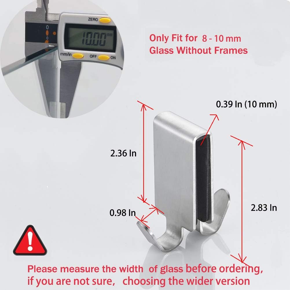 - Suitable over glass wall or glass door thickness 0.31-0.39in (8-10mm),please measure before ordering.If you are not sure of the thickness of glass,please choose the hook with wider version ,thank you