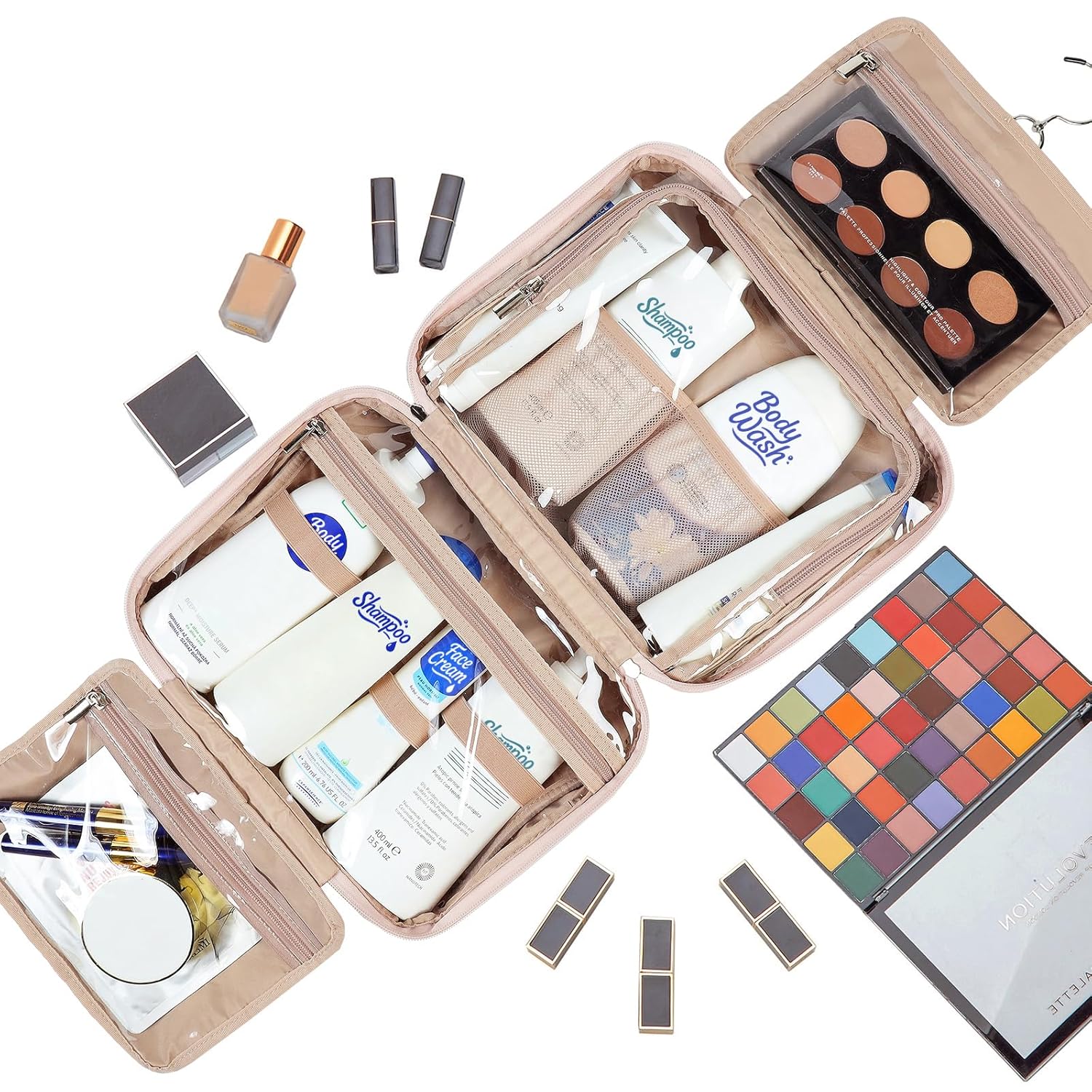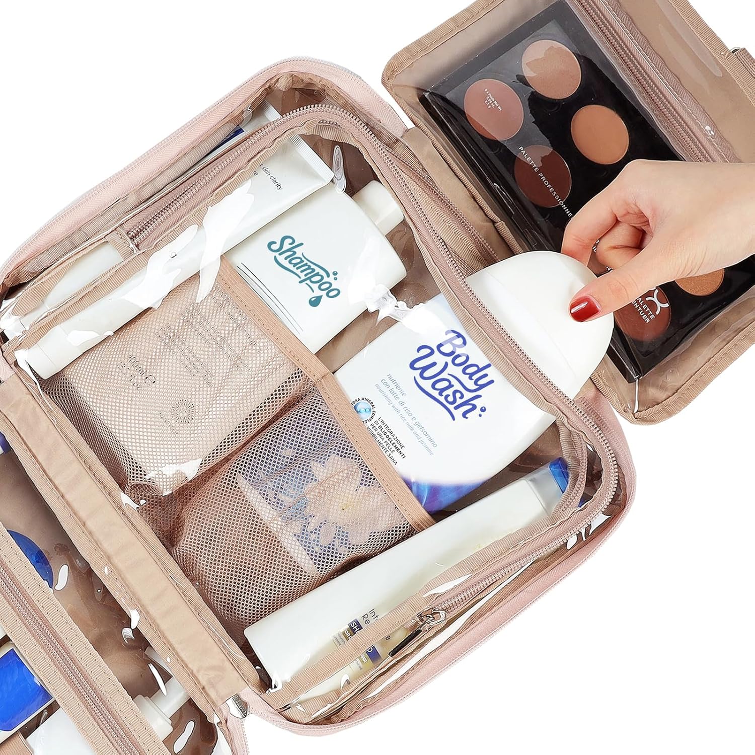 - MULTIFUNCTIONAL COMPARTMENTS - Fully open with a transparent design that gives you a comprehensive glimpse of your stuff. Four different compartments keep your toiletries in place, and a front zipper pocket provides additional storage with convenience