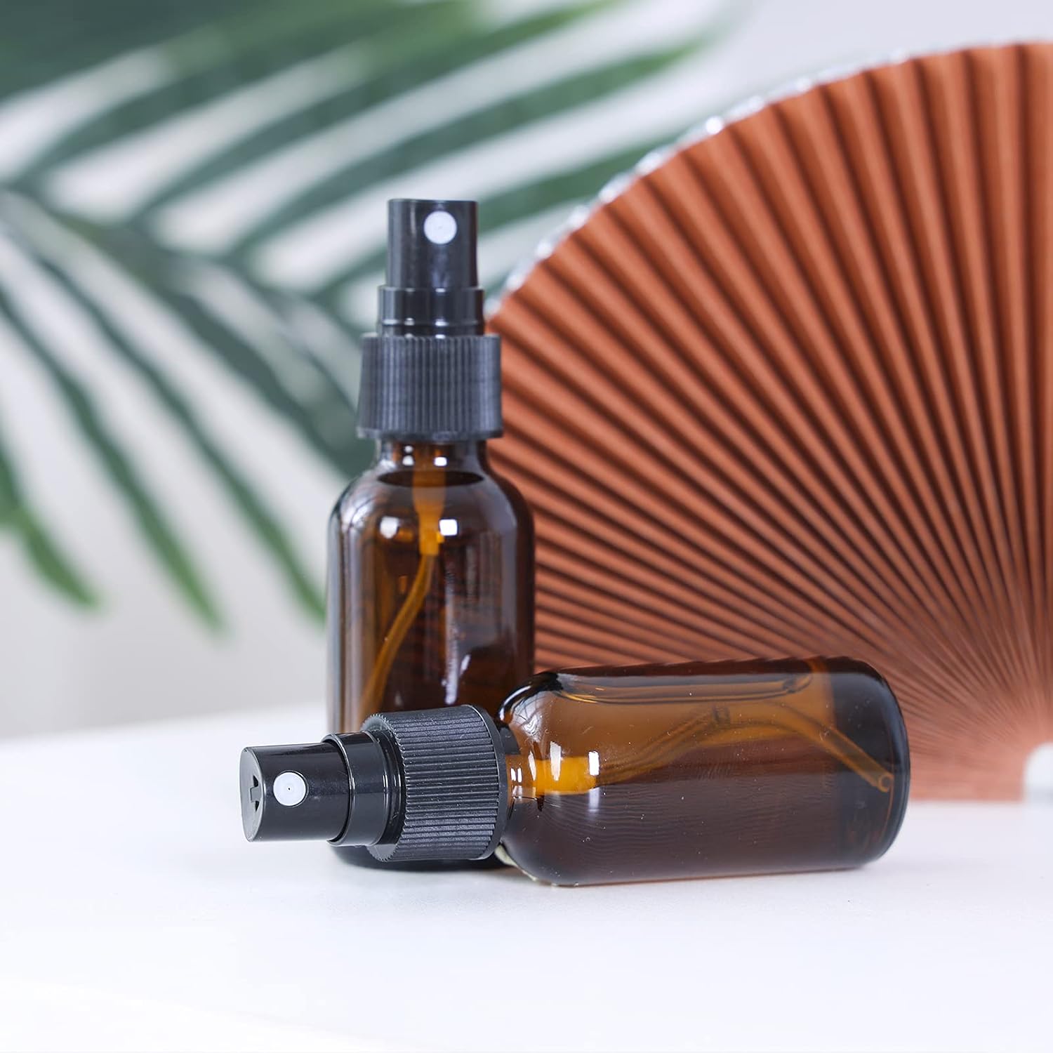 2oz Glass Spray Bottle, Fine Mist Boston Glass Bottles with Black Fine Mist Sprayer Small Clear Bottles for Essential Oils, Bath, Beauty, Hair & Cleaning, Amber, Pack of 24