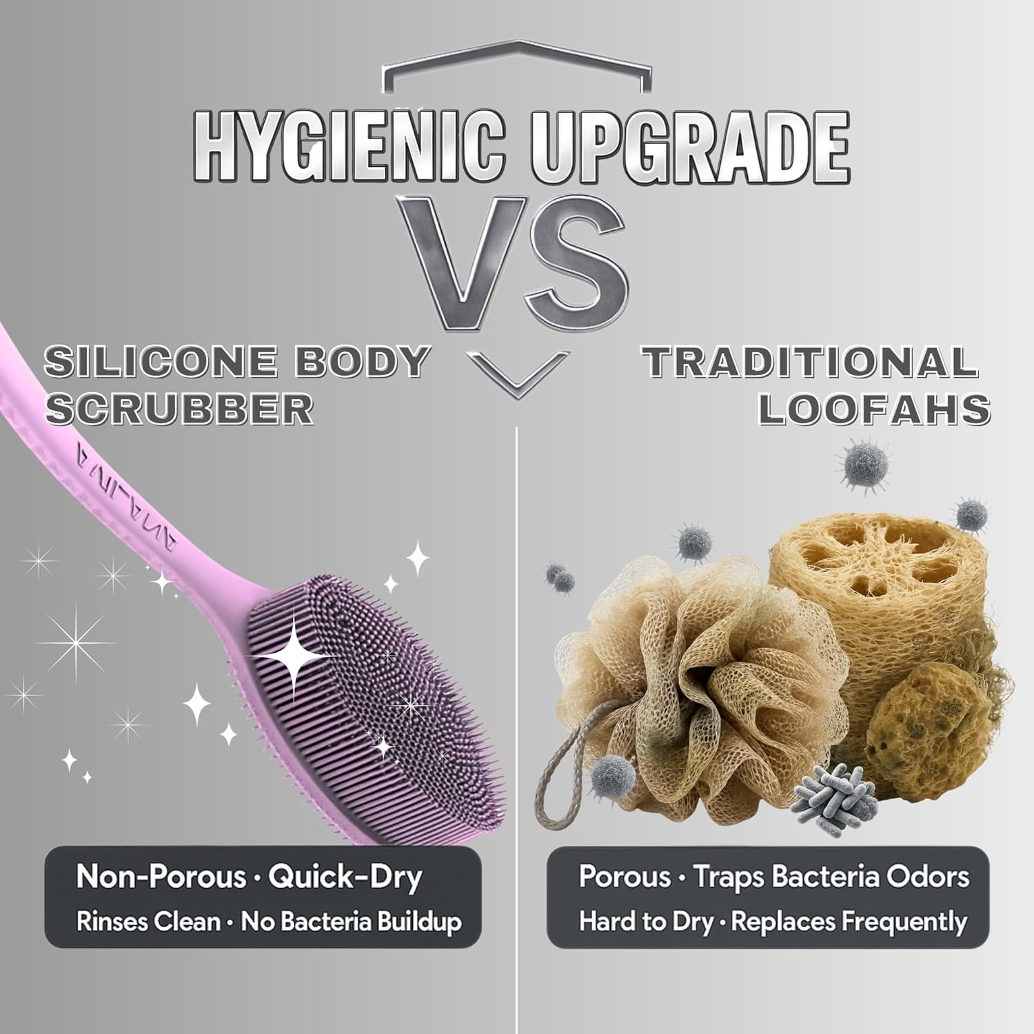 Avilana Silicone Body Scrubber – Gentle Shower Brush & Loofah Alternative- Food Grade & Lab Tested – Fast-Drying, Hygienic, BPA-Free Silicone Body Gentle Exfoliator (Pink, Long Handle)