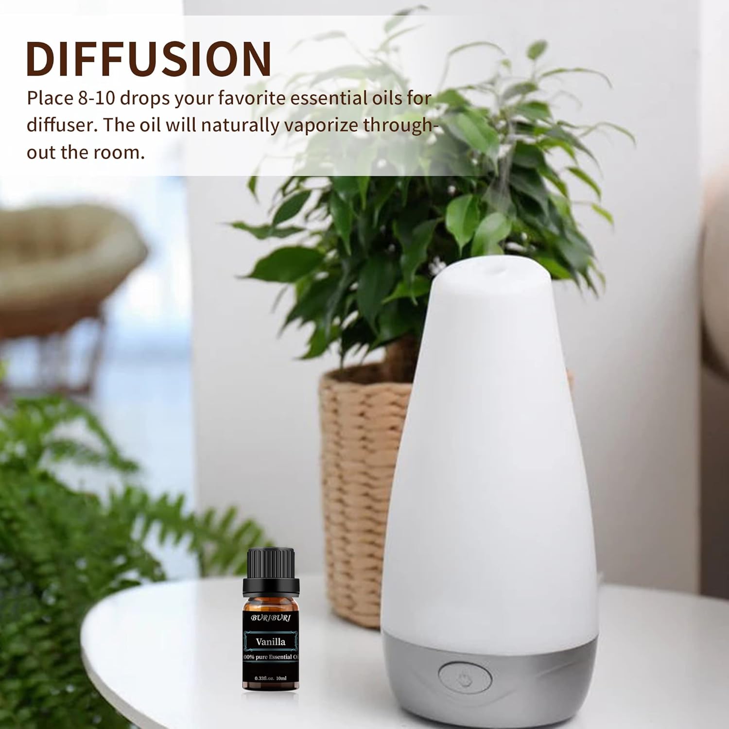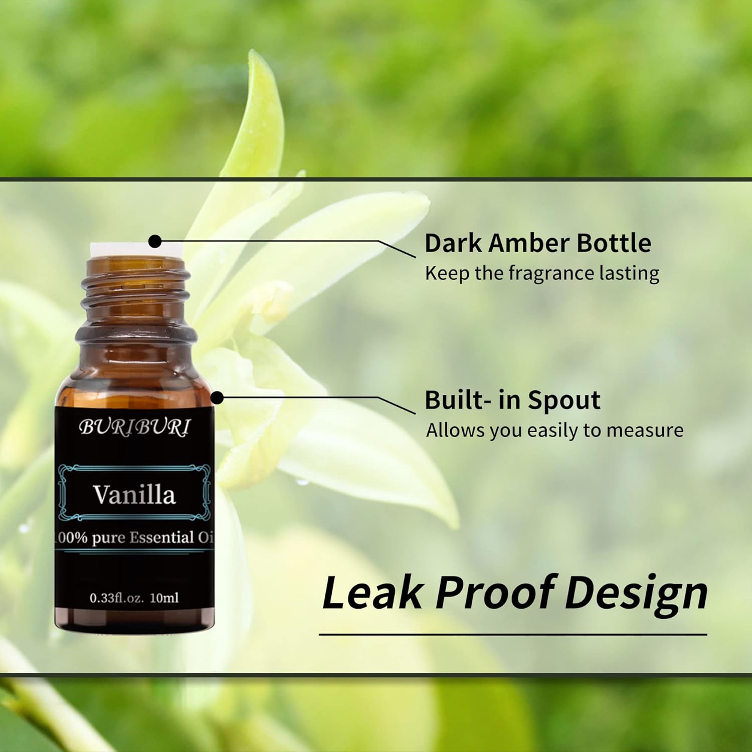 - Packing Includes: 10ml Tea Tree Essential Oil x1, 10ml Eucalyptus Essential Oil x1,10ml Vanilla Essential Oil x1. With no adulterants or dilution, 100% pure quality. BURIBURI scented oil is bottled in a durable amber glass bottle.