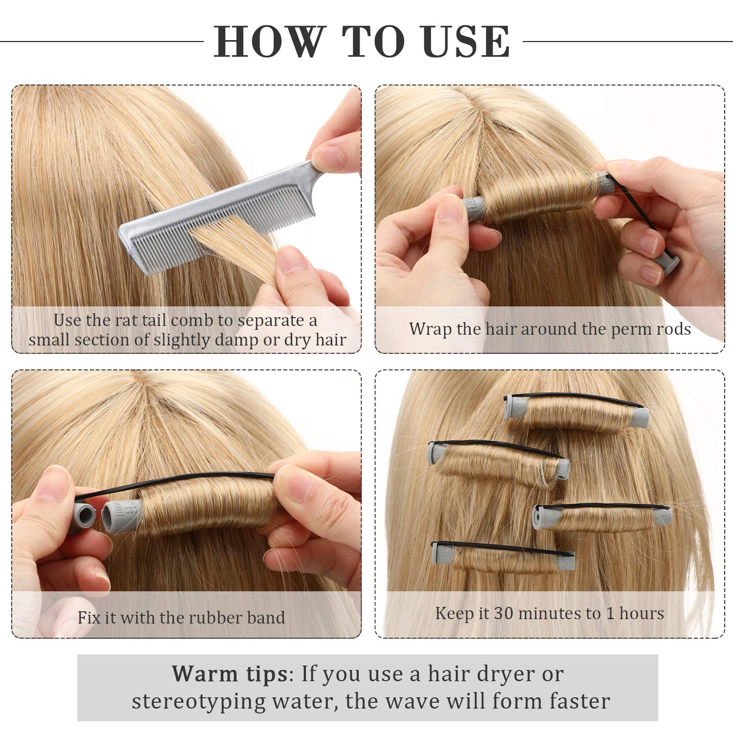 - Simple to apply: just use the rat tail comb to separate a small handful of slightly damp or dry hair, and wrap it on the rods; Then use the rubber band to fix it, does not require heating, no harm to the hair; Just wait for a while, you can make a natural curling hairstyle, adjust the direction of starting roll hair in or out can create various hair wave