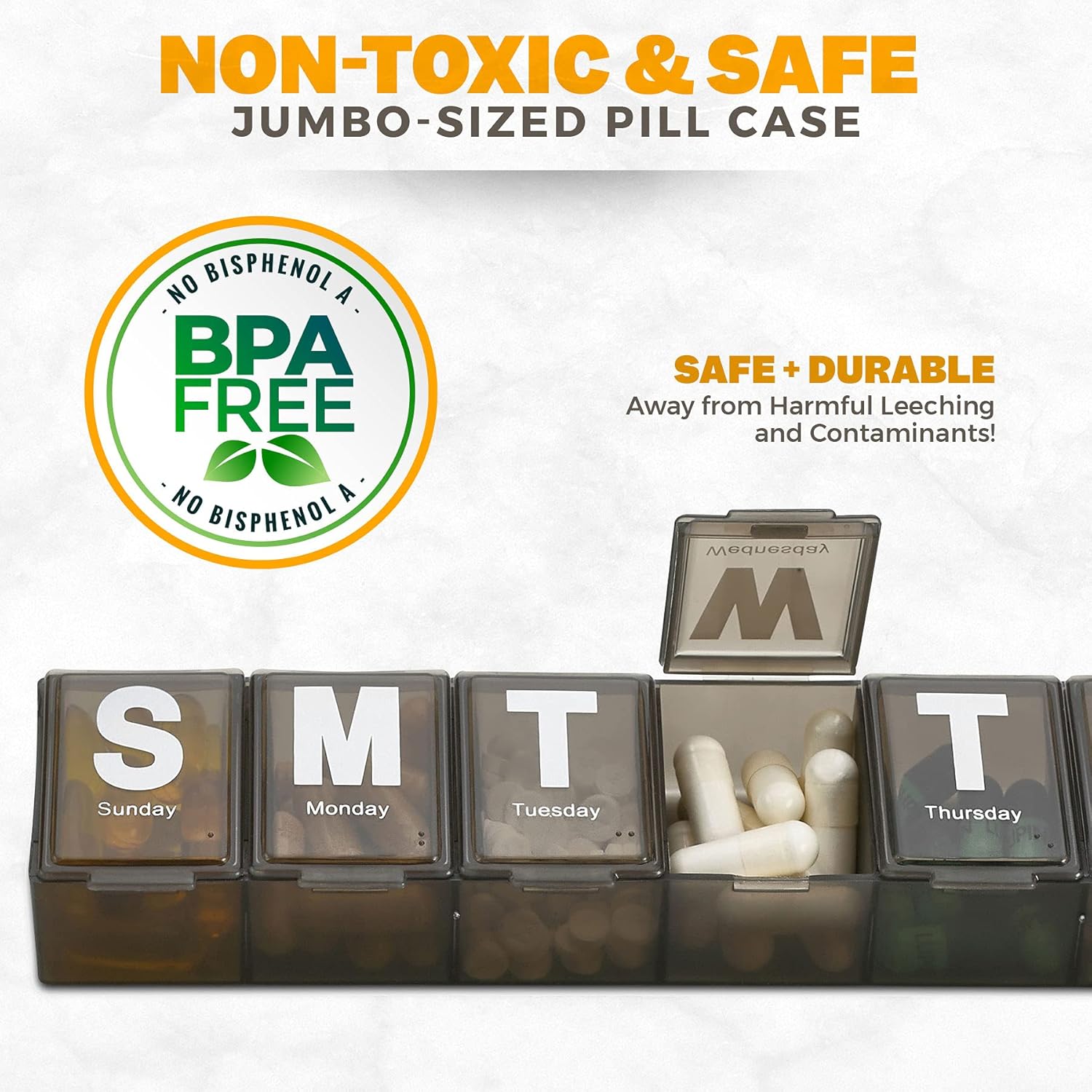 Weekly Pill Organizer - Extra Large with Easy to Read Jumbo Letters Vitamin Container, BPA Free - Daily Travel 7 Day Medication Pill Box Case, (Black)